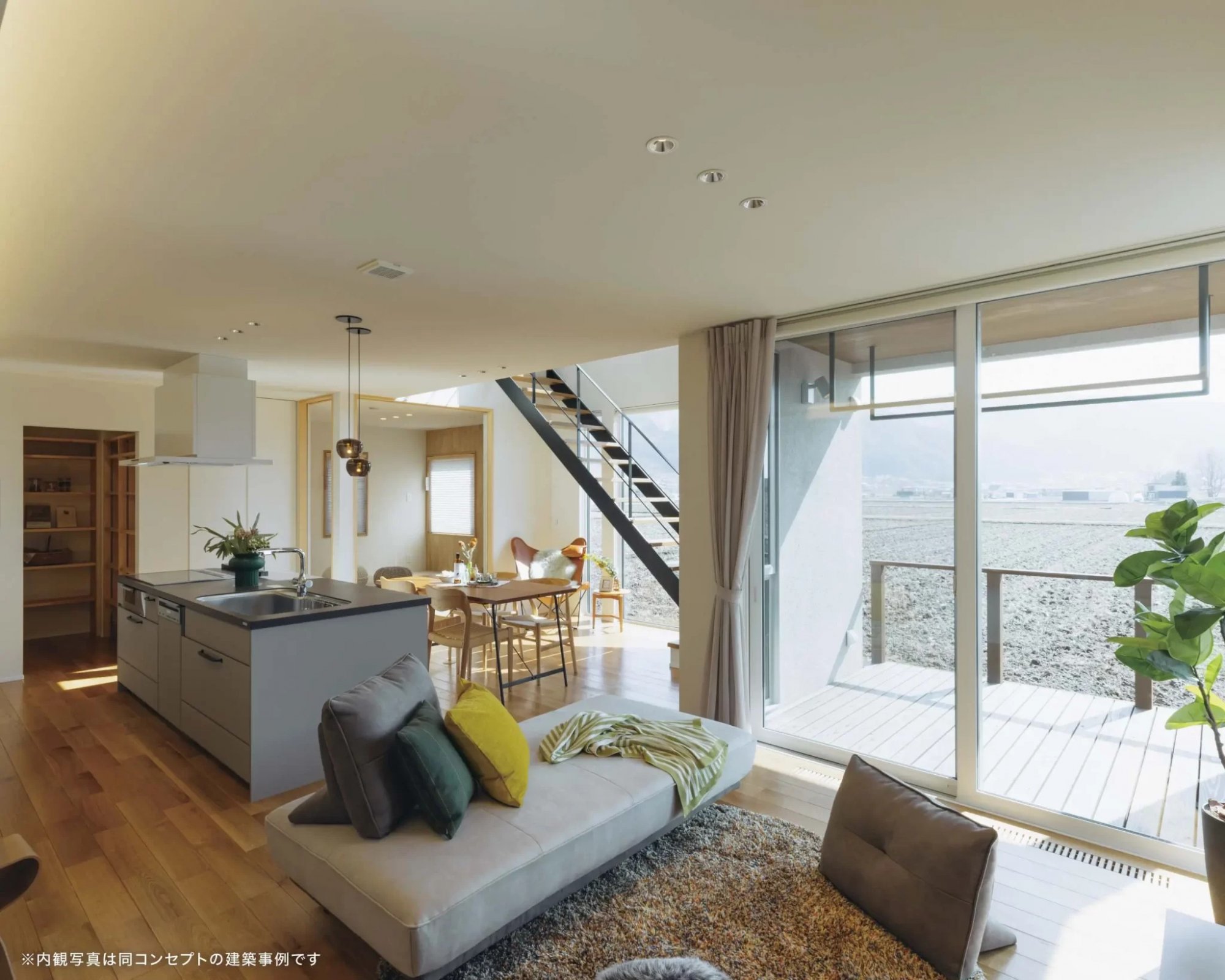 吹き抜けと勾配天井が、22帖のLDKにのびやかな開放感。キッチンに立つと、L字に配した三つの窓の先に、信州らしい爽やかな景色が広がる設計。外からの視線をほどよく抑えた4.5帖のテラスや、窓に寄り添うヌックが、室内に心地よい居場所と広がりをつくります。