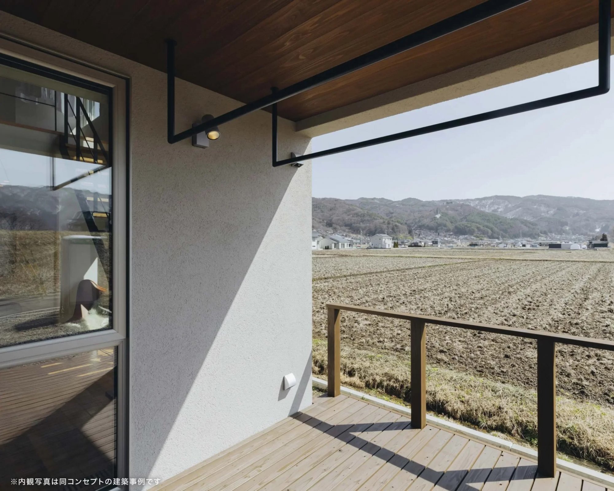 県内の気候や暮らし方を読み解き、一棟ごとに最適解を導くサンプロの住まい。雪を自然に落とす切妻屋根と、テラスには吹き込みを抑える1.5間の深い軒。玄関にはアウトドア用品も無理なくしまえる収納を確保。日々の出入りから季節の道具まで、雪国での暮らしやすさに配慮した住まいです。