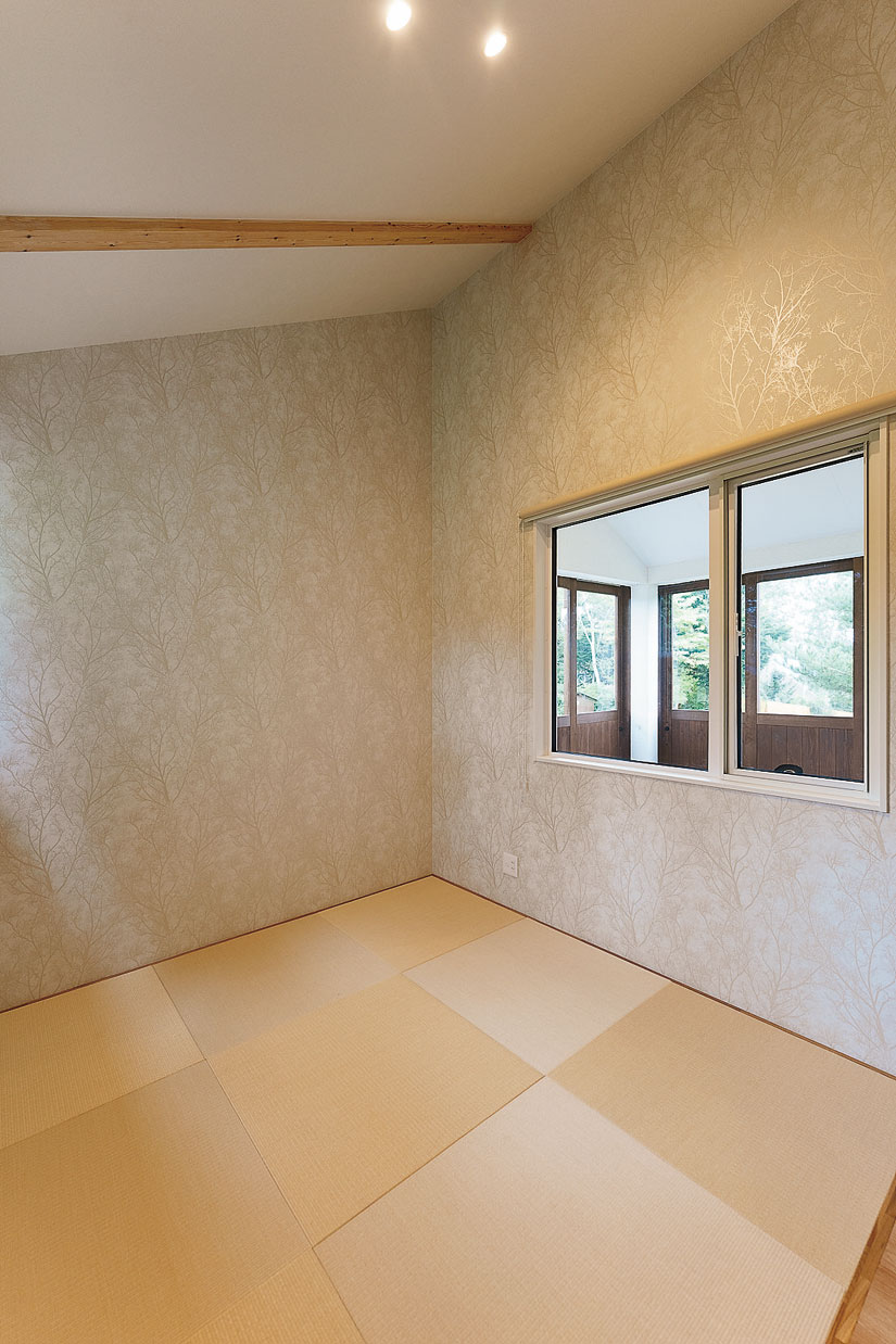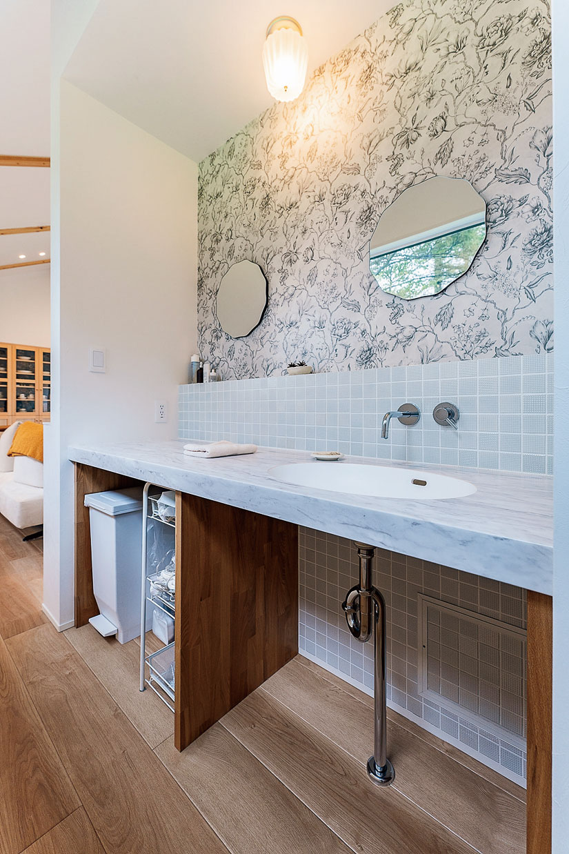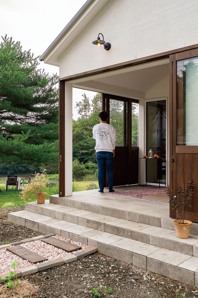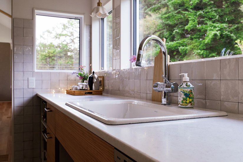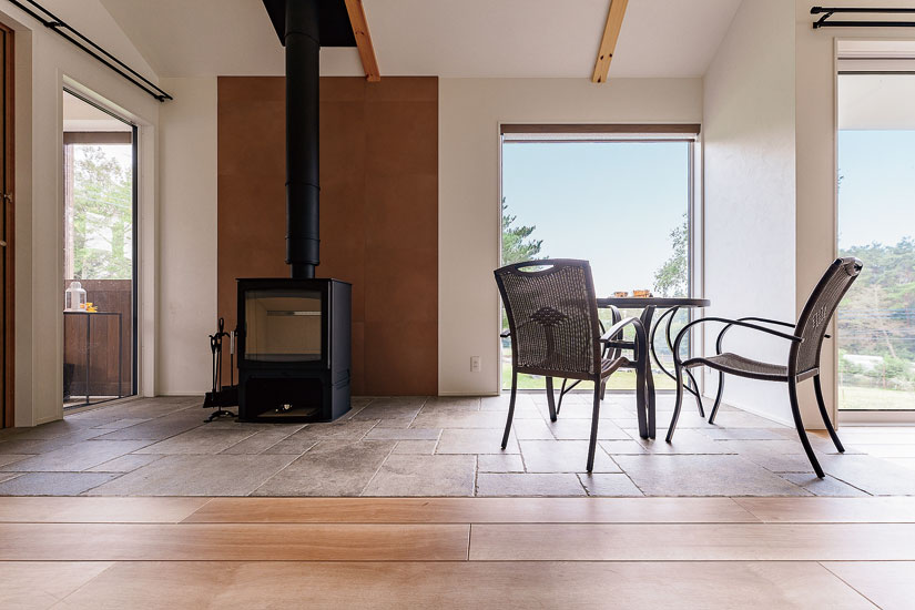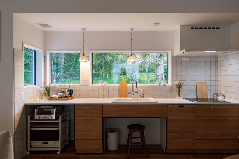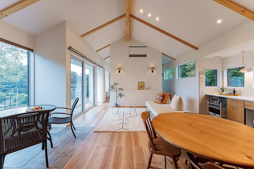 東西に長い平屋は約28坪。水回りを境にLDKエリアと寝室エリアをゆるく分けた、オープンかつシンプルなつくりだ。内と外のクッション的な役割を担う広い風除室、回遊できる動線、美しい森を眺めながら家事ができるキッチン、ひだまりのヌックなど、コンパクトな中にもこだわりが満載。「冬の寒さが心配でしたが、トリプルサッシを入れ気密性や断熱性も十分。薪ストーブの炎を眺められる冬が今から待ち遠しい」と奥さまはほほ笑む。