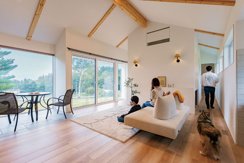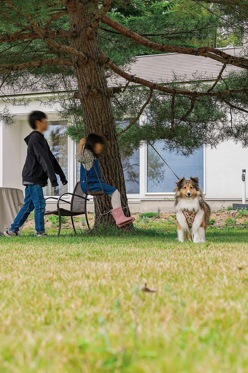 ドッグランやブランコがある広い芝生の庭は、子どもたちと愛犬の格好の遊び場。駆け回る様子にご夫妻は目を細める。「思い描いていた理想の夏が過ごせました。この家で思い出を重ねていくのが楽しみです」。(ナガノの家 Vol.25 2026年 春・夏号掲載掲載)