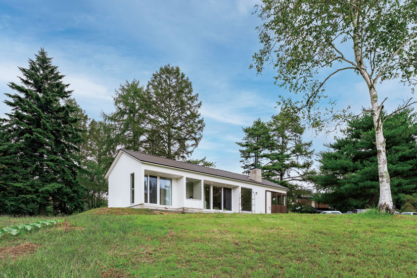 高原の丘の上に建つ白い家は、まるで一枚の絵画を思わせる美しい佇まい。白の塗り壁がやさしい風合いで、煙突をぐるりと囲んだ石張りや玄関の木部がアクセントを添える