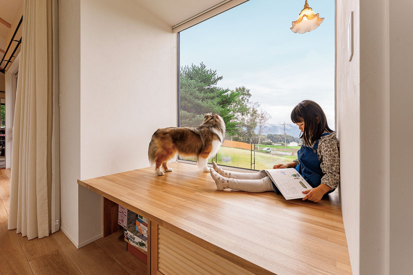 夏から秋へと季節が移ろう中、浅黄色の芝が茂る丘の上にひっそりと建つN邸。リビングの大窓からは「お天気の日は富士山まで見える」という抜群の眺望が楽しめ、外からは窓から漏れる光や読書に耽る子どもたちの姿が垣間見える。通りがかった人の心までほっこりあたたかくなるような、温もりに満ちた佇まいが印象的だ。