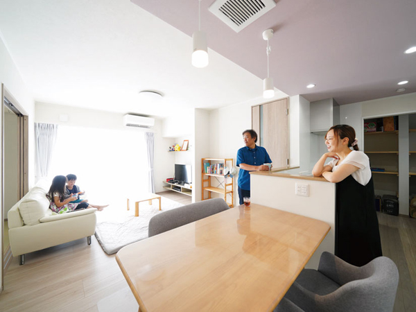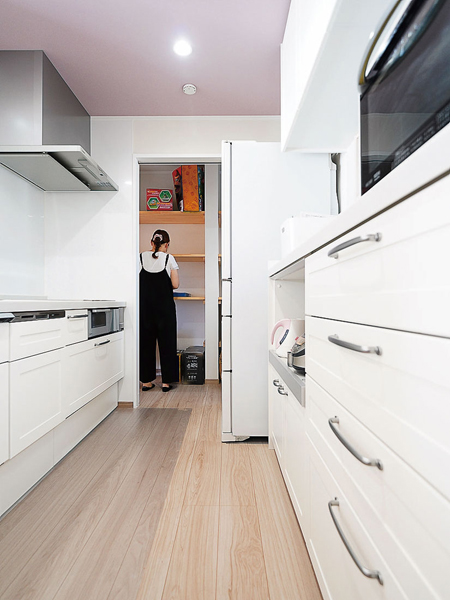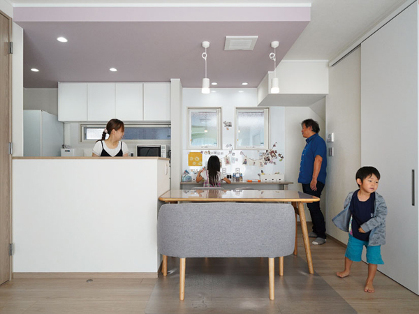キッチンエリアは天井高を切り替え、スモーキーピンクのクロスに。明るい色味ながら落ち着きがあり、LDKを柔らかなニュアンスで彩る。ダイニング脇にはスタディコーナーを設けて様子を見守れるようにした