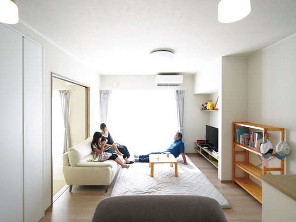 閑静な住宅地に建つA邸。東西に奥行きのある敷地を活かし、どの部屋にも満遍なく南の光が入るようにつくった住まいには、Aさんご夫妻とふたりの子どもが暮らしている。