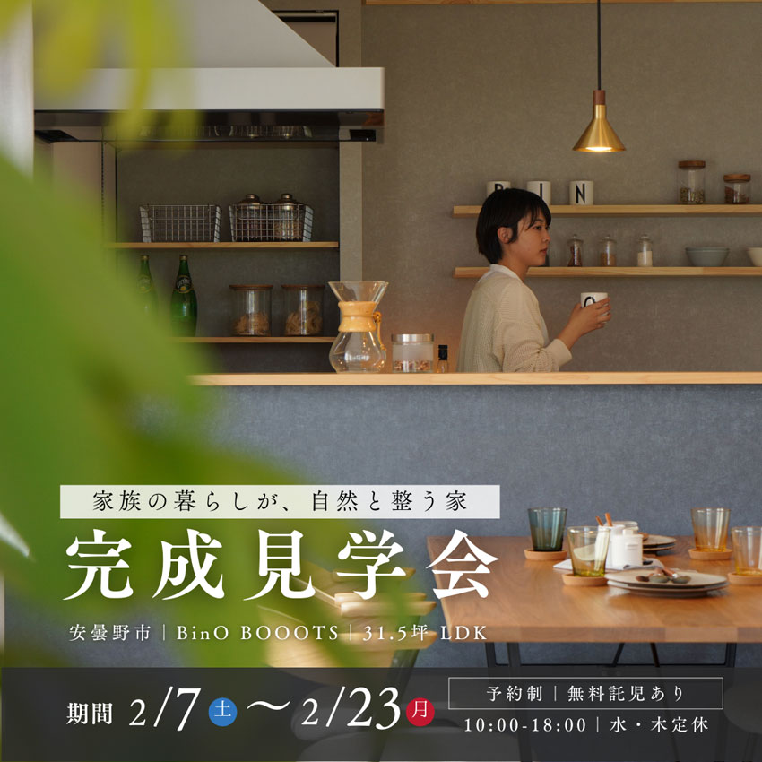 今回ご覧いただけるのは、BinO「BOOOTS」の完成見学会です。