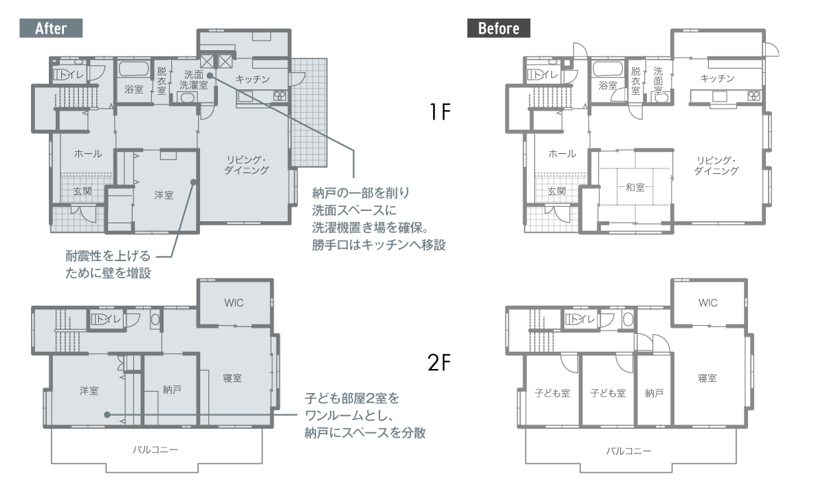 加えてご夫妻が希望したのは、耐震と基本性能の向上。耐震面では壁を補強&増設し、さらに制震ダンパーを入れることで耐震の評点が約0.7から1.3以上へ向上した。床と天井、壁に断熱材を入れ、断熱サッシへの交換で断熱性能もアップ。さらに老後のことも考え、1階に寝室となる洋室を確保するなど、未来の安心を描く住まいへと生まれ変わった。