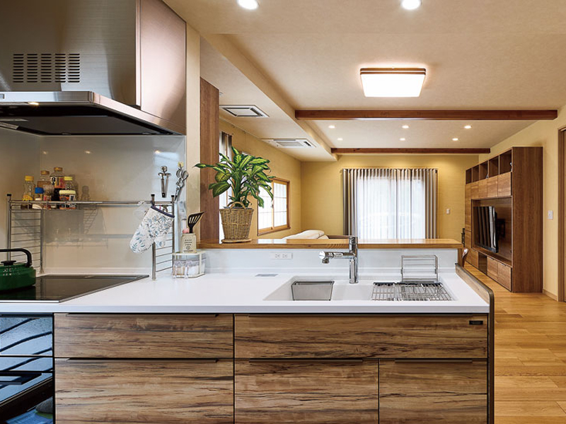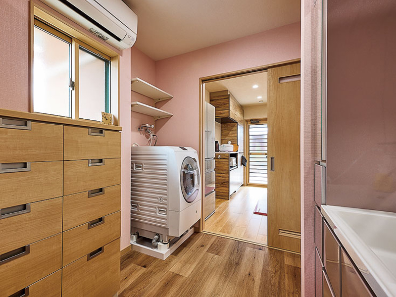 「プランはほぼおまかせでしたが、家事動線が格段に便利になり、暮らしやすくなったと家族と話しています」と笑みを浮かべるご主人。以前は洗濯機が脱衣室から離れた納戸にあったうえ、物干しは2階のベランダで、日々不便さを感じていたという。またキッチン脇の納戸は勝手口も兼ねていたため、広さと収納力を活かしきれていなかったのだとか。そこでリフォームを機に、脱衣室とひと続きの洗面スペースに洗濯機を移動。勝手口は移設してキッチン直結とし、洗濯スペースから最短動線で物干しエリアまでの移動が可能に。機能的な家事動線と、収納スペースの有効活用を同時に叶えることができた。