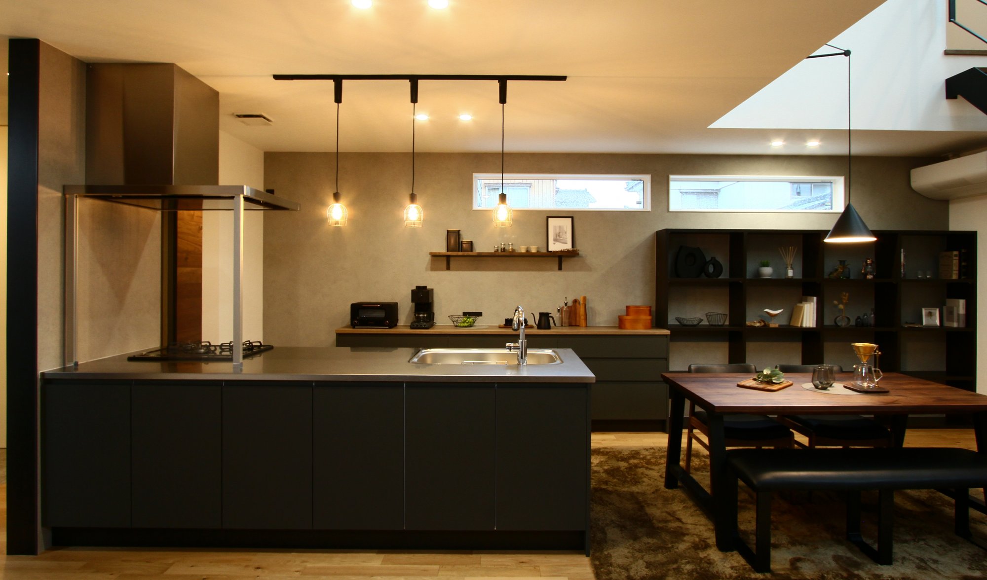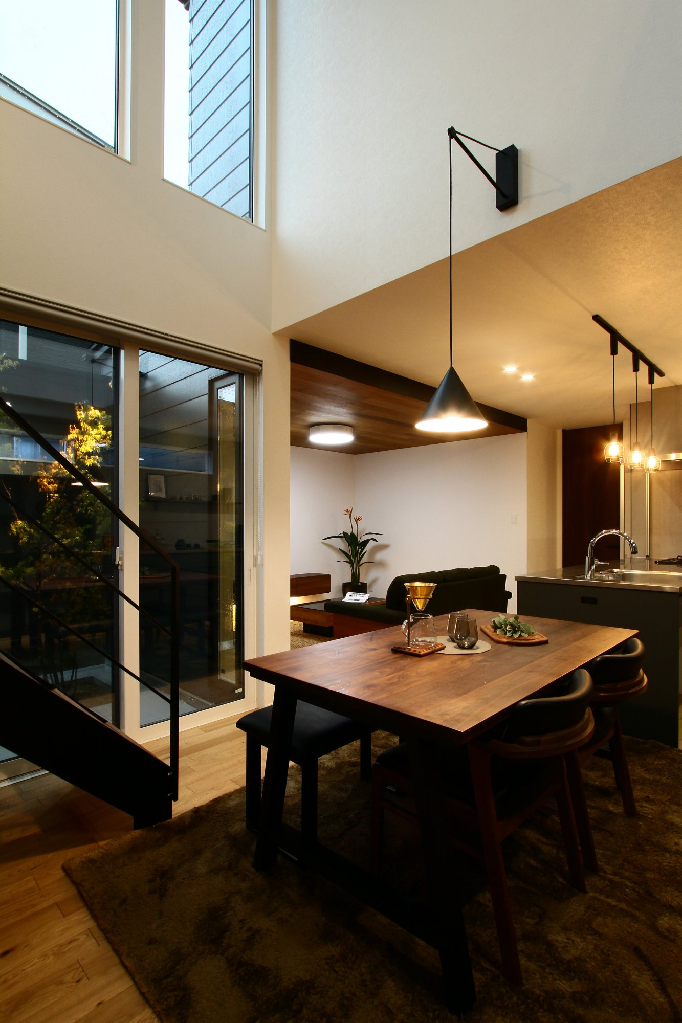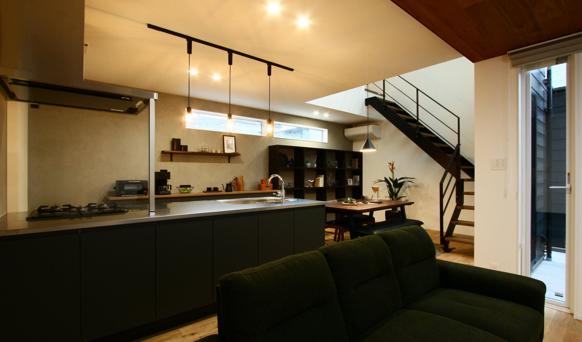 フラットキッチンを中心とした24帖の広々LDKは、ダイニングの吹き抜けと鉄骨階段から自然光が差し込む明るい空間。