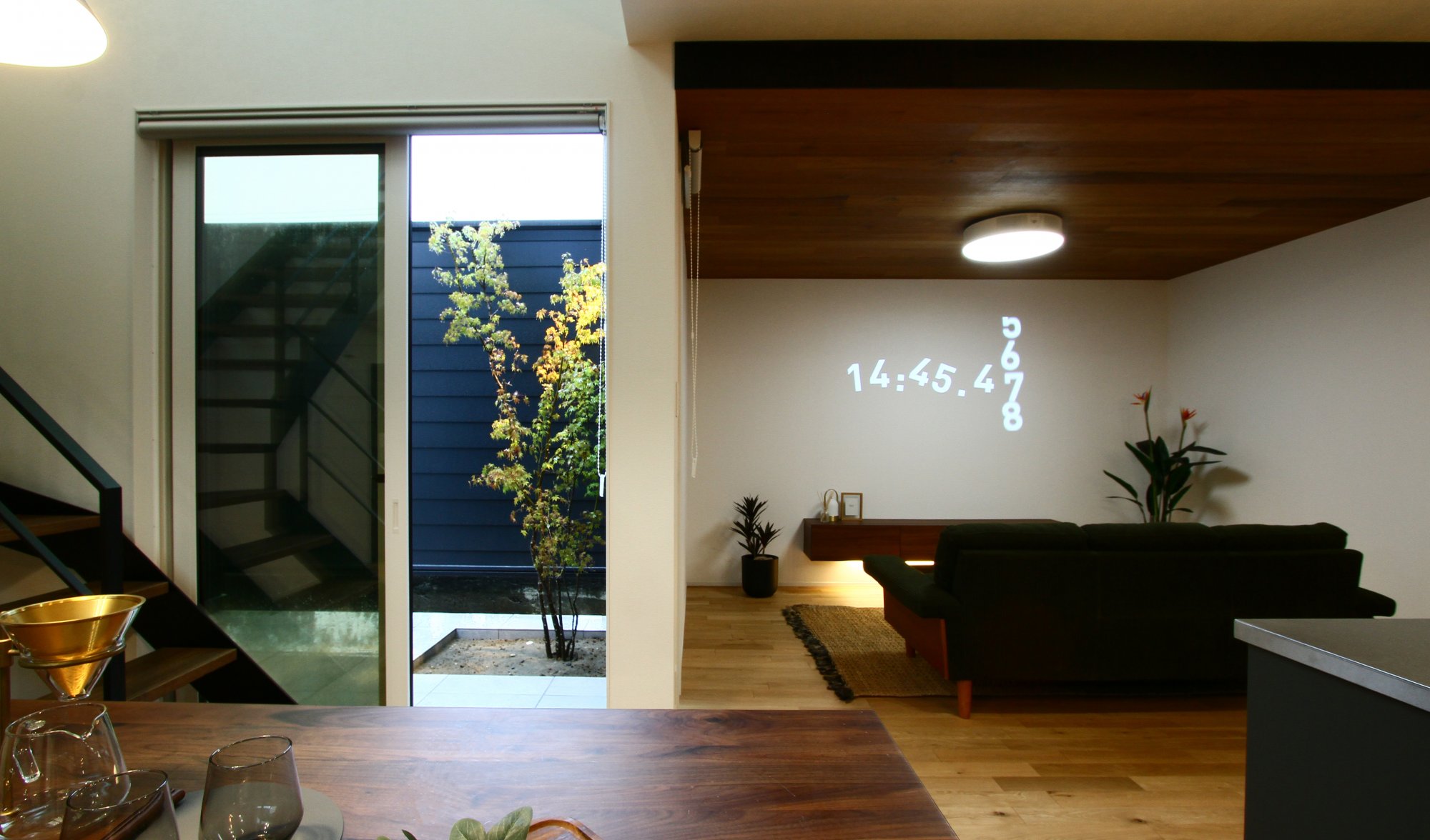 リビングはTVの代わりにプロジェクターを設置するため、折り下げ天井+間接照明で落ち着いた雰囲気に仕上げました。