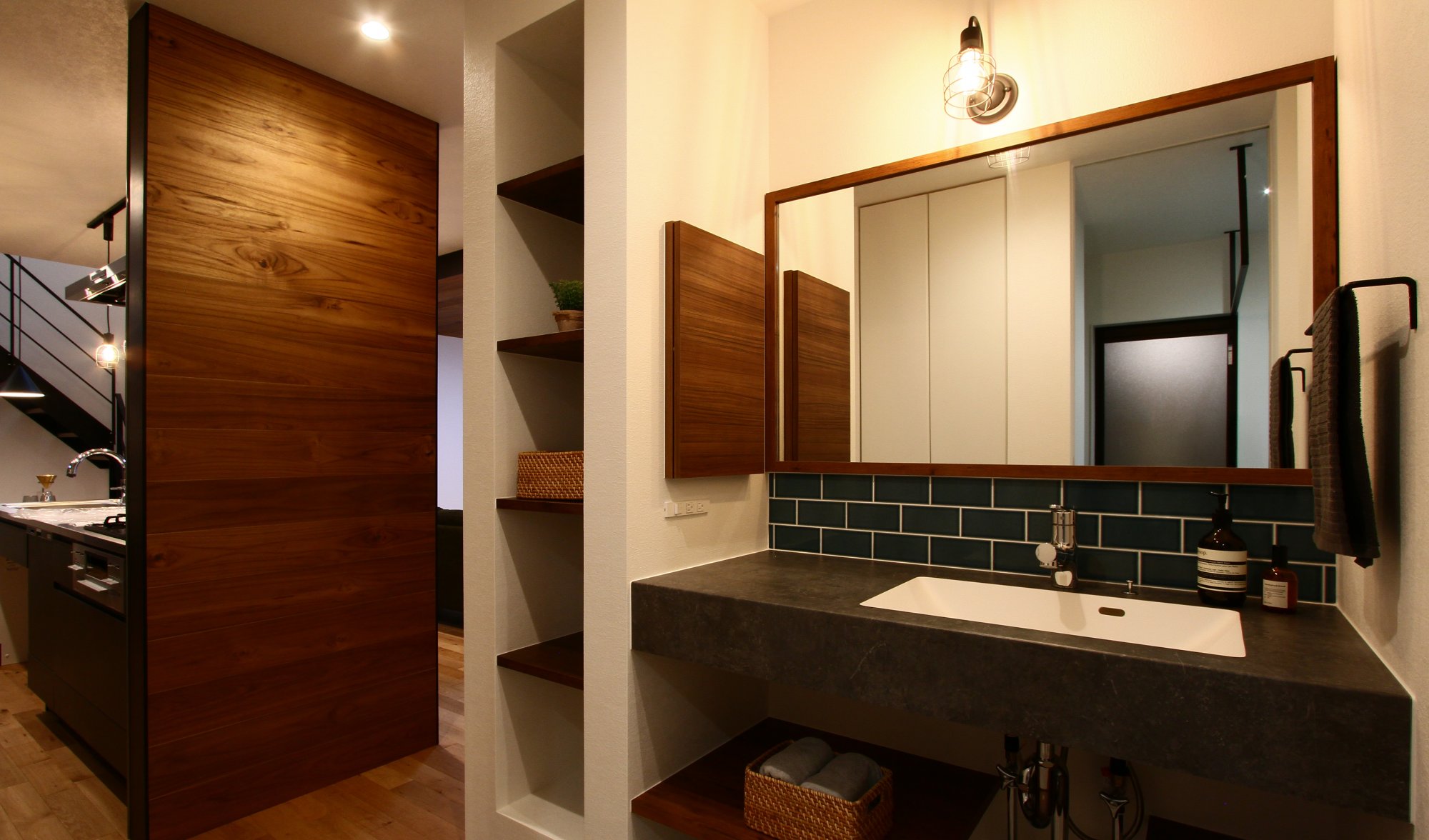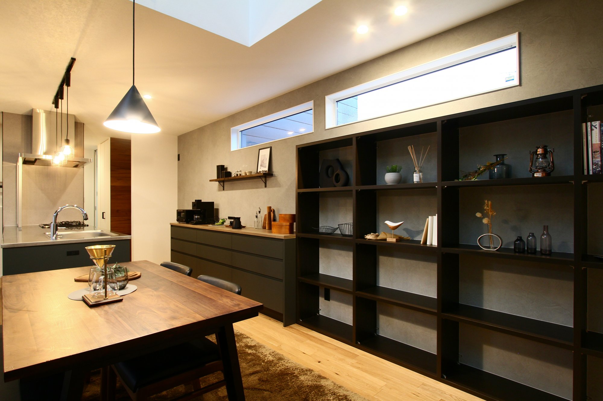 1階は無垢床と変わらない質感の挽板や木のリアルパネルを基調に、ブラックのガラスドアやアイアン金具の飾り棚などを合わせてヴィンテージ感をプラス。