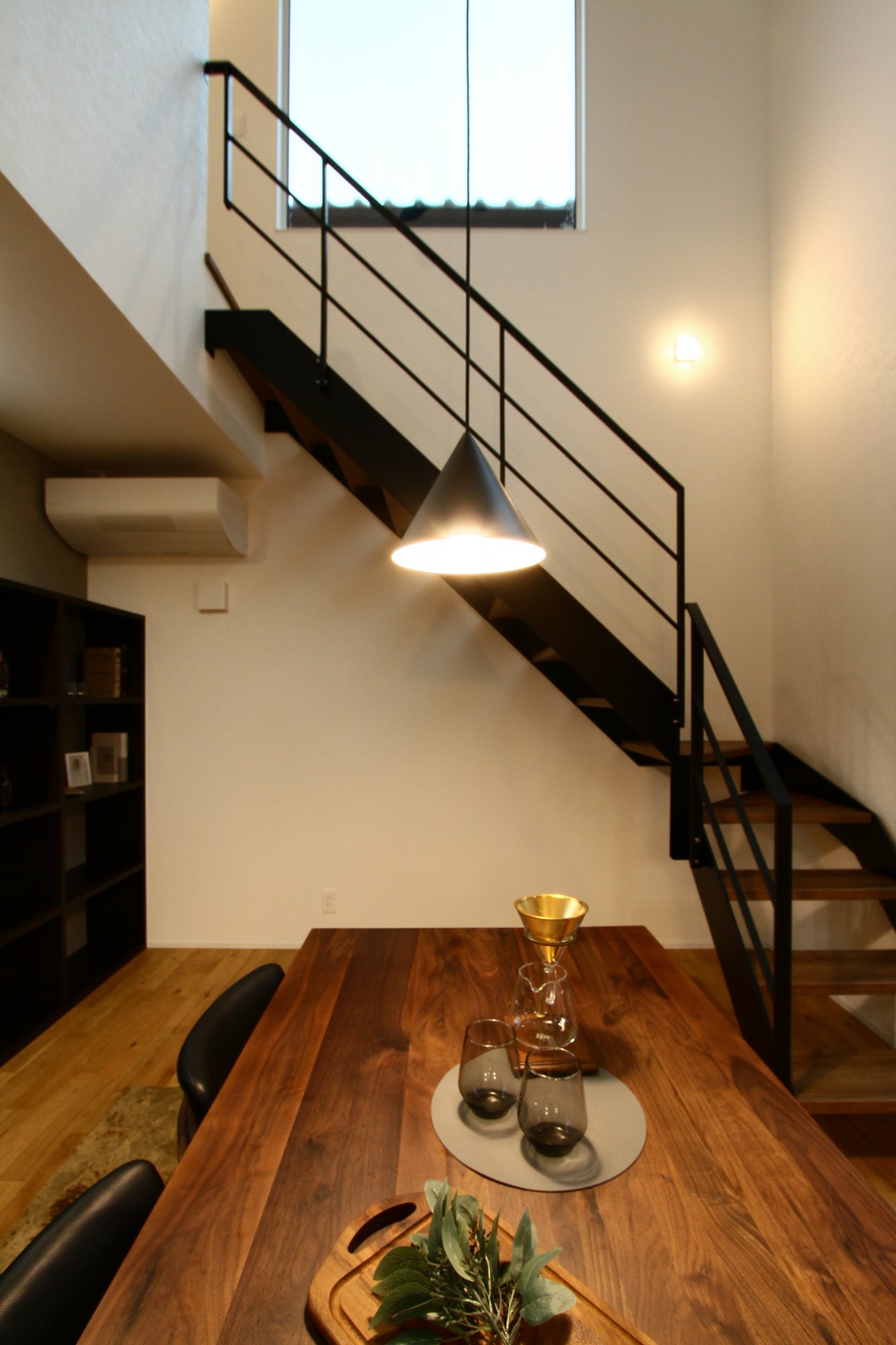 フラットキッチンを中心とした24帖の広々LDKは、ダイニングの吹き抜けと鉄骨階段から自然光が差し込む明るい空間