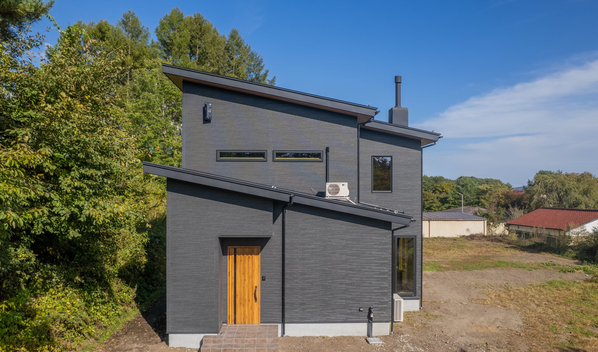 外観は軽井沢の景観を損なわないよう、ブラック×木目でシックに仕上げました。