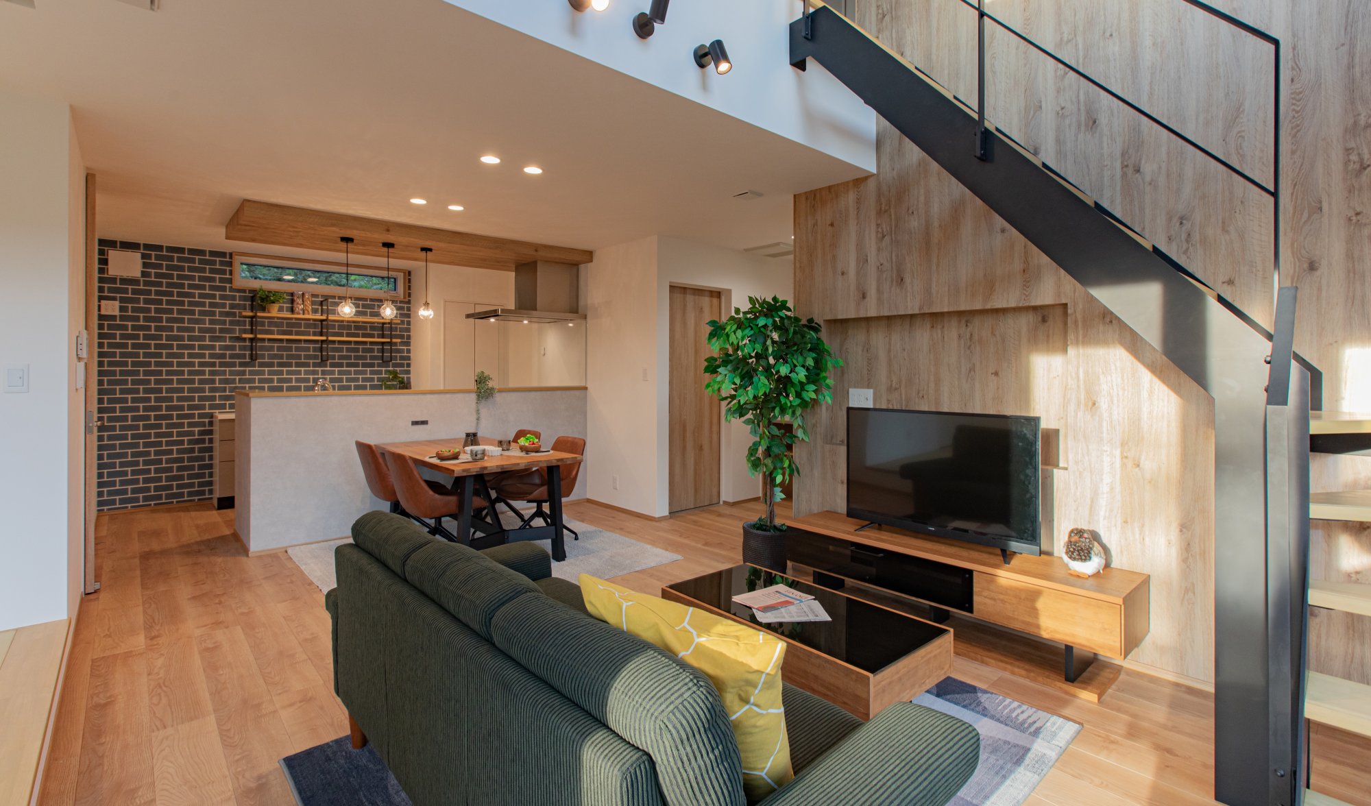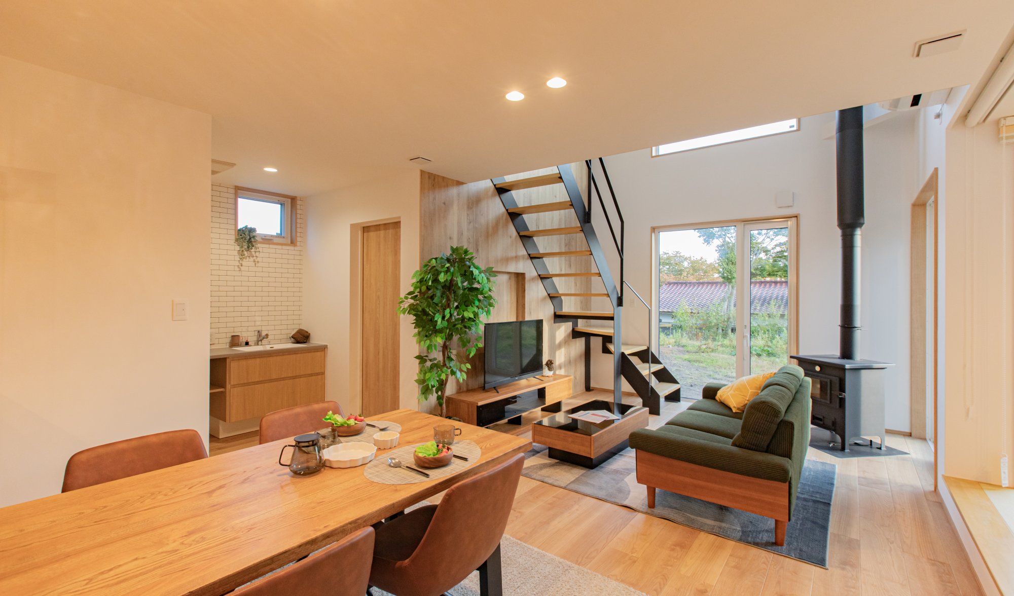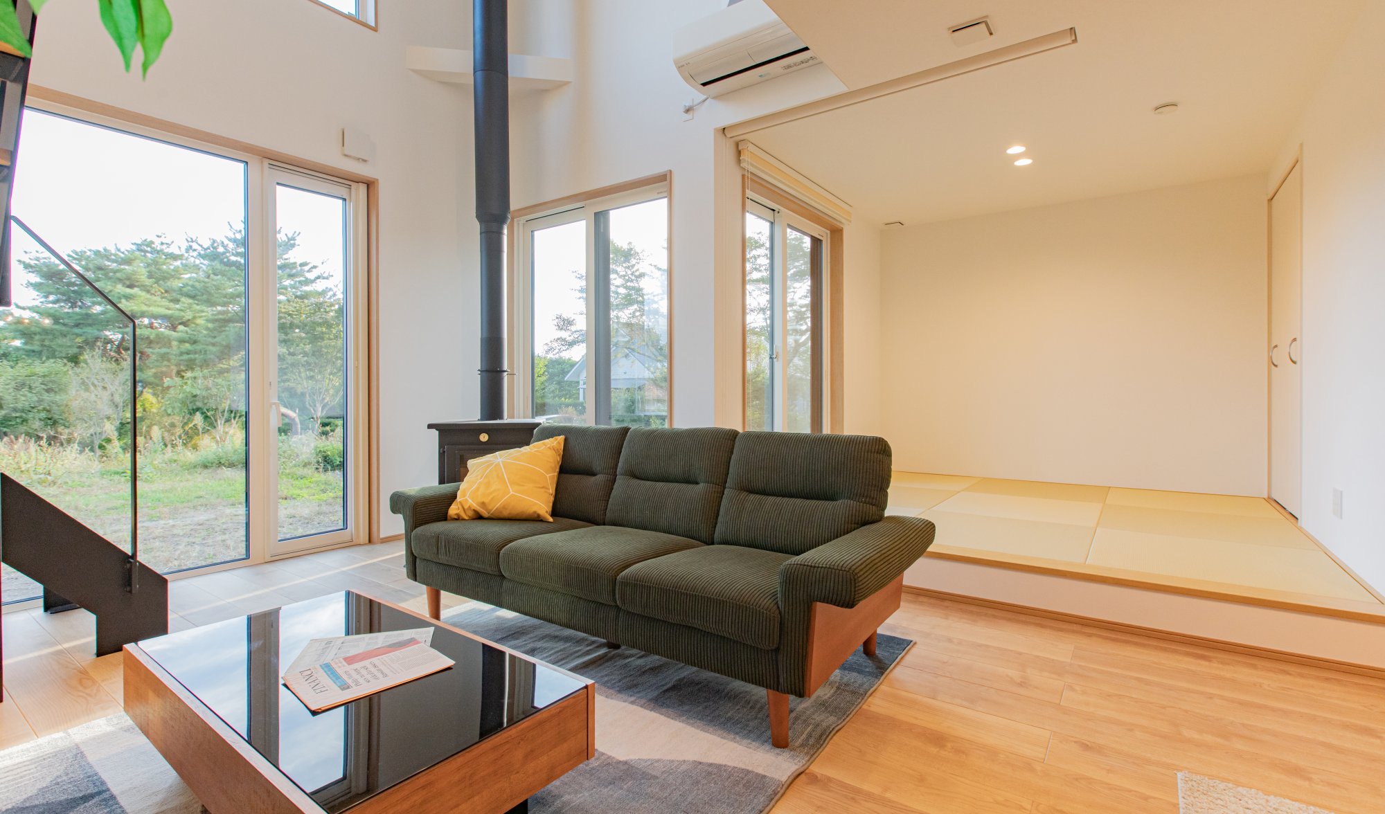 和室を含めて約23帖のLDKは、大きな窓と吹き抜けで縦にも横にも空間が広がる開放的な設計。