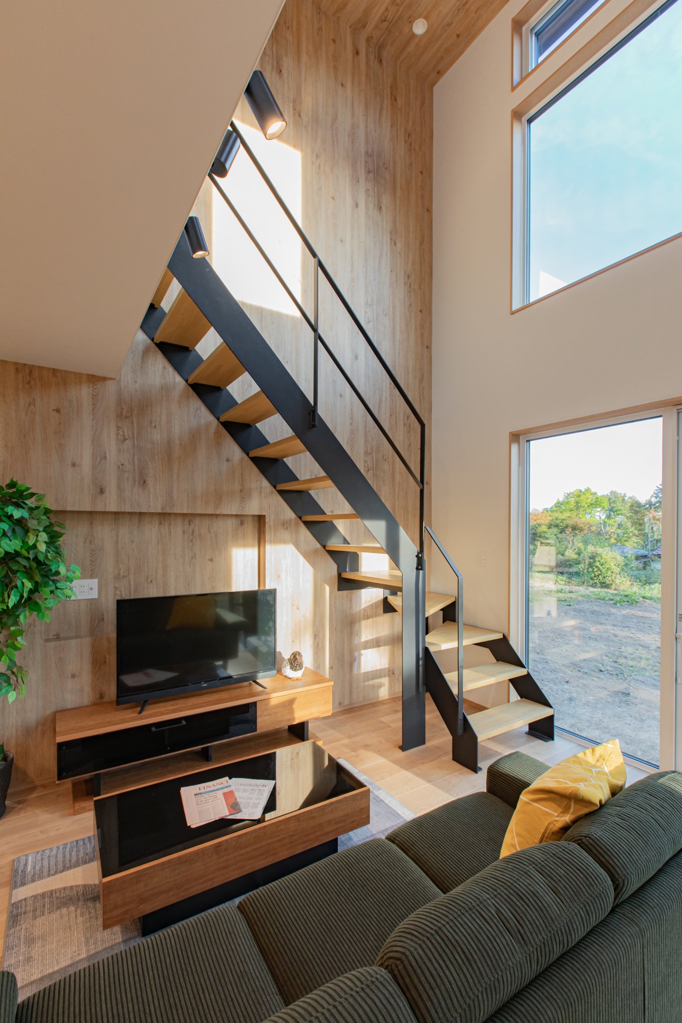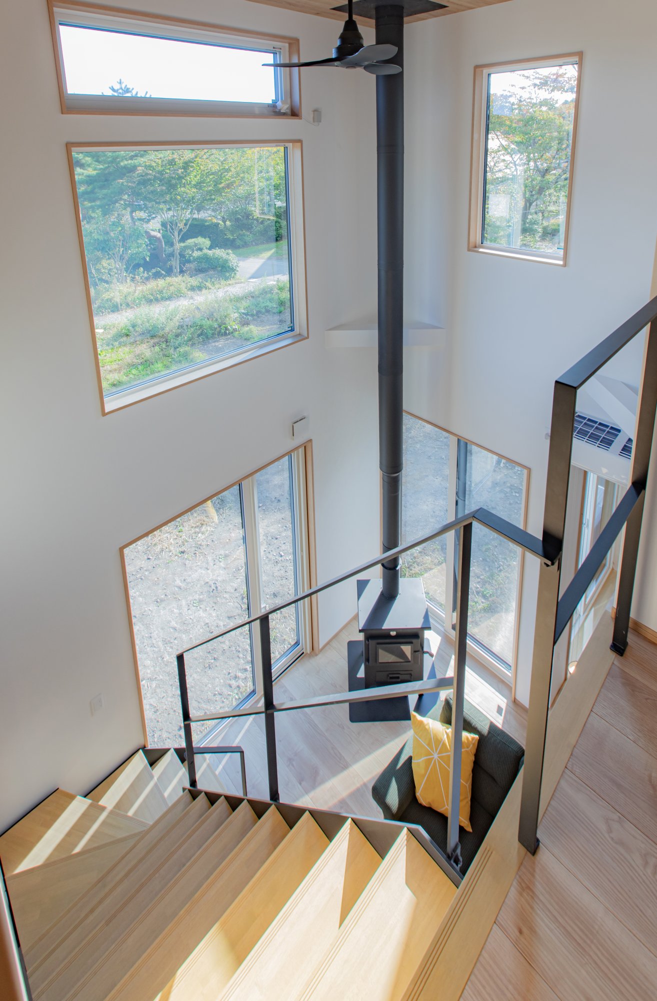 大きな窓と吹き抜けで縦にも横にも空間が広がる開放的な設計