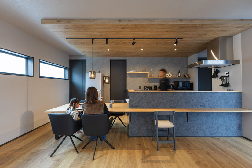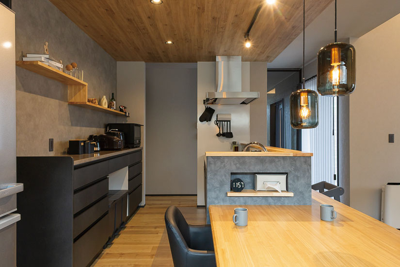 夫婦そろって「とても気に入っている」と話すキッチンまわり。奥さまの希望で、キッチンとダイニングテーブルを横並びに配置し、ひと続きの動線に。調理から配膳、片付けまでがスムーズで、日々の家事負担を軽減してくれる。キッチンカウンターは作業台としても活躍