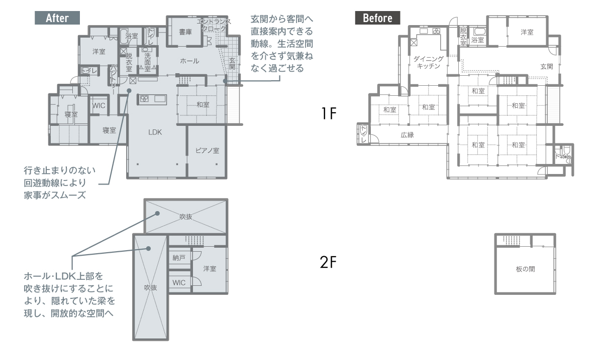 お父さまの他界により、思いがけず実家を相続したAさま。築100年以上の古民家の冬の寒さや時代に合わない間取りから、当初は建て替えを検討していた。しかし、住宅会社と話す中で、心が傾いたのは担当者のひと言がきっかけ。「『こんなに素晴らしい建物は見たことがありません』と、目を輝かせながら言ってくださって。残した方がいいのかなと」と振り返る奥さま。そして担当者を信頼してリフォームを任せることにした。
