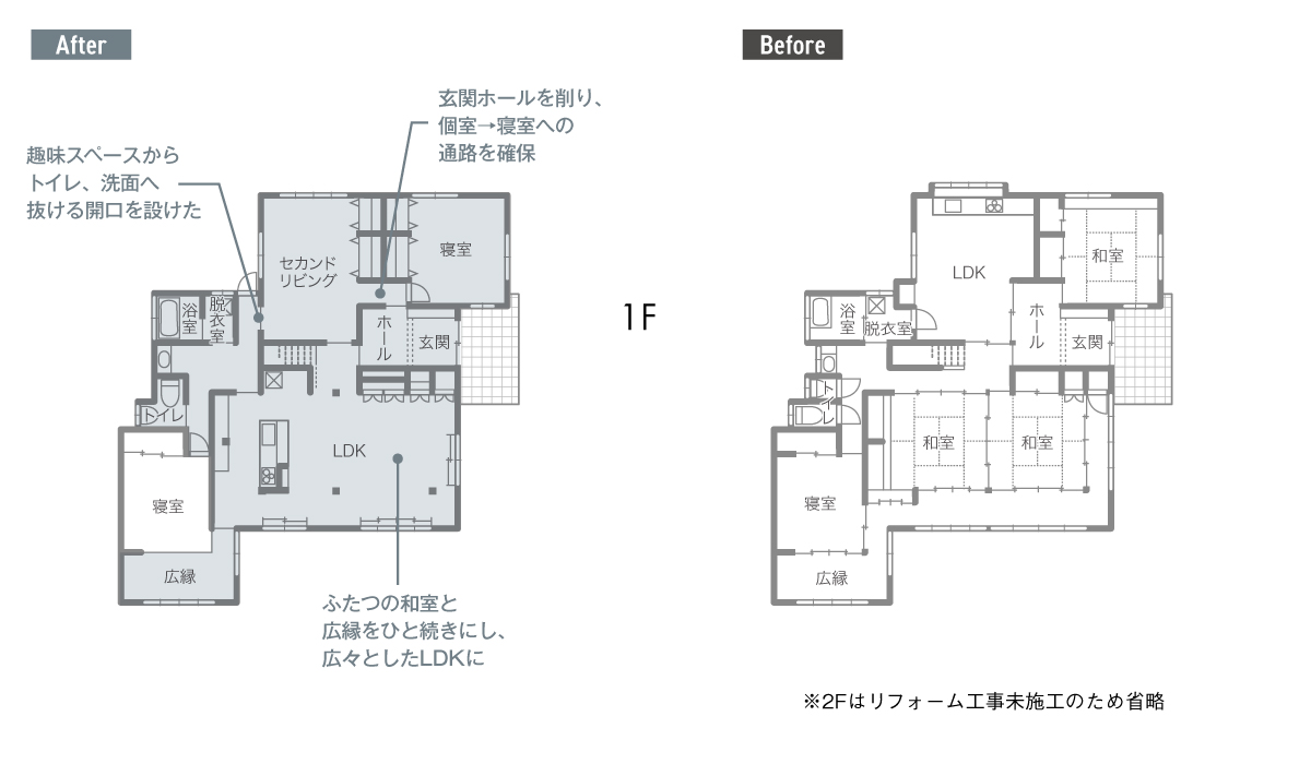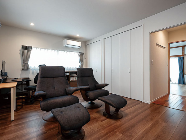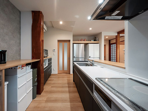 普段使われていなかったふた間続きの和室を改修し、北面にあったLDKを南面へ。光が降り注ぐ、広々した空間へ一新した。細かく分断されていた間取りはできるだけ仕切りを無くし、各スペースをつなぐ開口を設けて便利な回遊動線を実現。「キッチンを中心に回遊できるだけでなく、夫の居るスペースから勝手口へ直接出られるようになったんです。屋内外の行き来が両方便利になりました」と住み心地の良さを実感している。