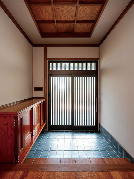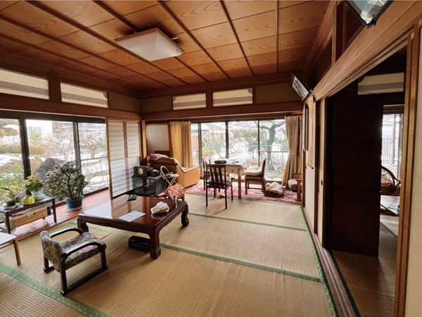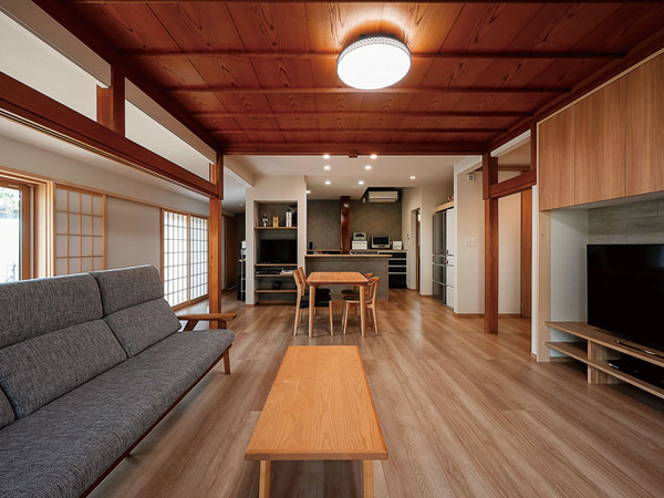 南側に移設したLDKを玄関ホール側から望む。リビングの天井は既存の竿縁天井で、丁寧な手仕事の技と趣きを残した。和室と広縁の間にあった長押と鴨居、支えていた柱を残して空間のアクセントに。一方で欄間は取り除き、視線の抜けをつくって開放感を生み出した