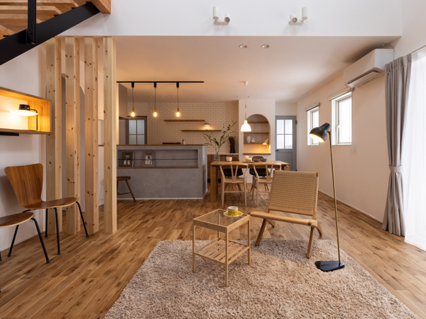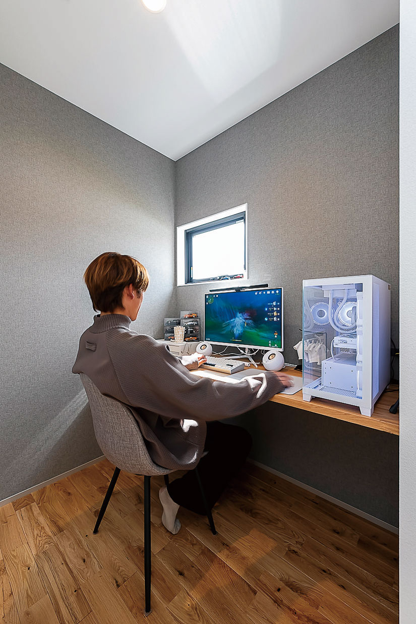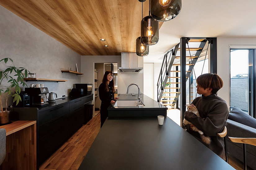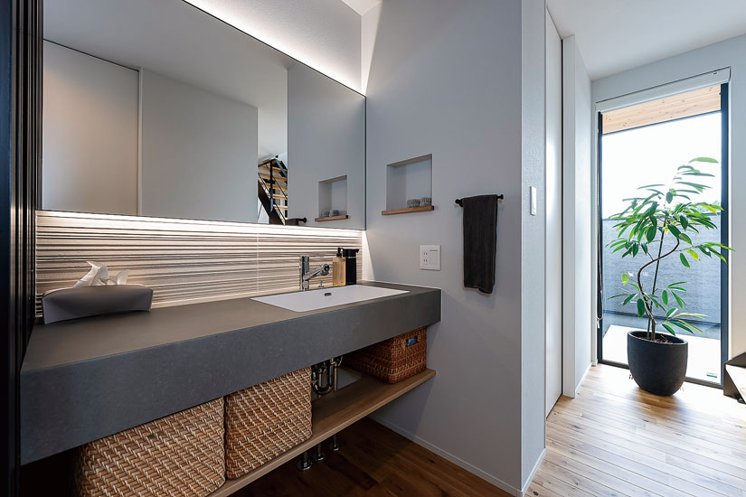 「プライバシーの保たれた、中庭のある家が欲しかった」と話すのはHさんのご主人。知人の新居を訪ねたのを機に家づくりを考え始め、情報収集をスタート。何十もの住まい紹介動画を見る中で、目に留まったのが、建築家と工務店がコラボして家をつくるR+houseだった。「惹かれる家はどれもR+house。迷うことなくサンライズを訪ね、すぐに依頼を決めました」。こだわったのは、プライバシーを保ちながら開放的に暮らせること、家事動線がコンパクトなこと。リビングや中庭、外観などにも具体的にイメージがあったという。「こうしたい、という形やデザイン、使い勝手が明確だったので、要素を取り込みながら形にしていただきました」。完成した住まいは、壁で囲った中庭を中心に空間が広がる家。L字型のLDKは二面が中庭に面し、吹き抜けからも光が降り注ぐようになっている。「カーテン無しでもオープンに暮らせて気持ちがいい」とご主人。奥さまも「動線がシンプルなので使いやすい」と笑顔だ。