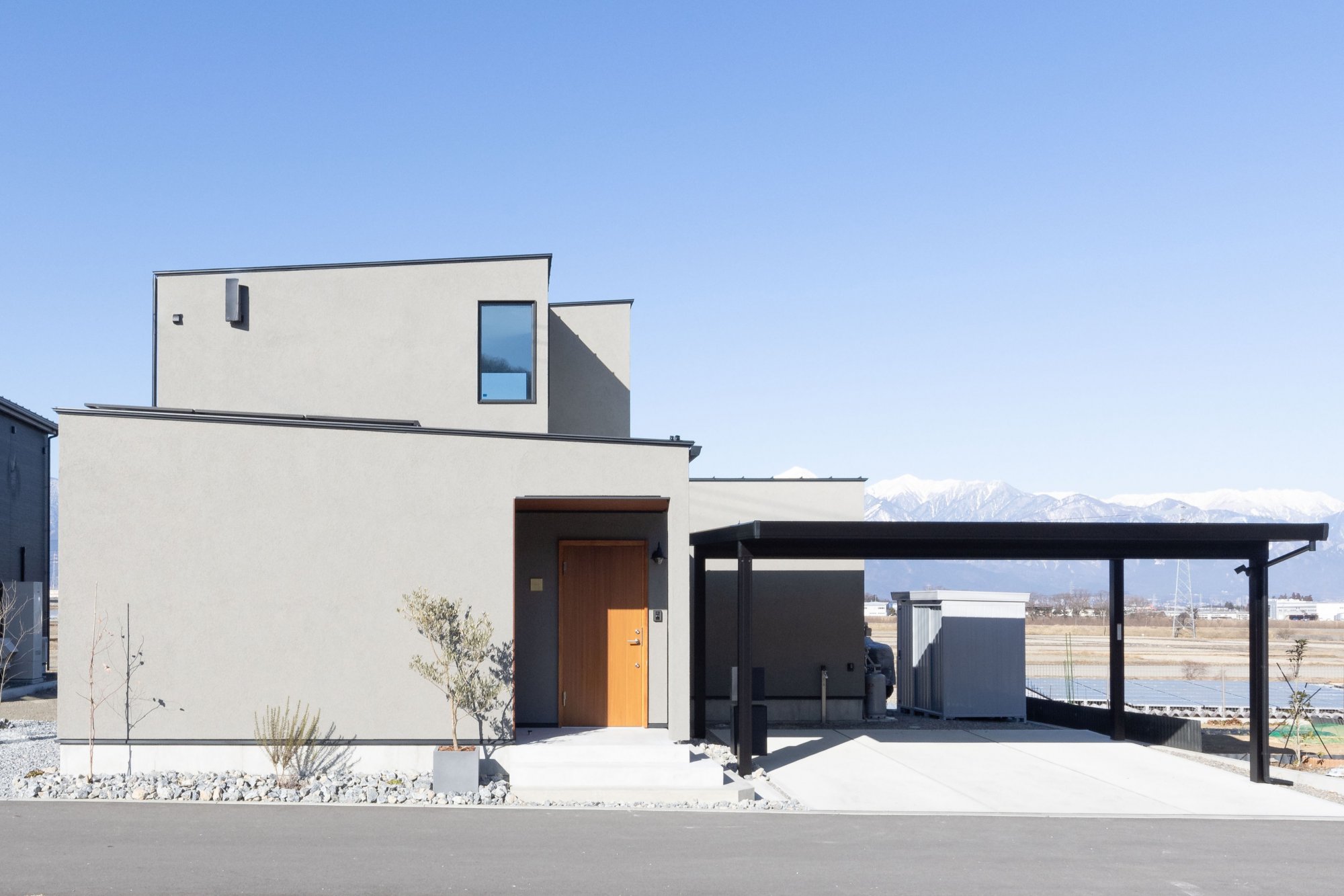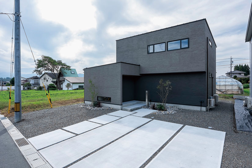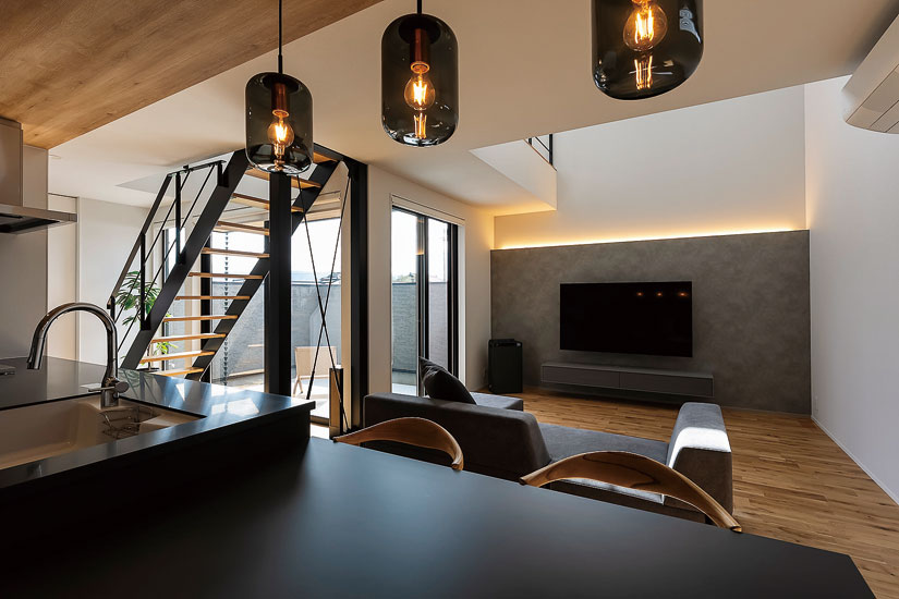 キューブを積み重ねたような、モダンなシルエットが目をひくH邸。一見すると窓の少ないデザインだが、室内に入ると驚くほど光が溢れ、開放的な空間が広がっている。