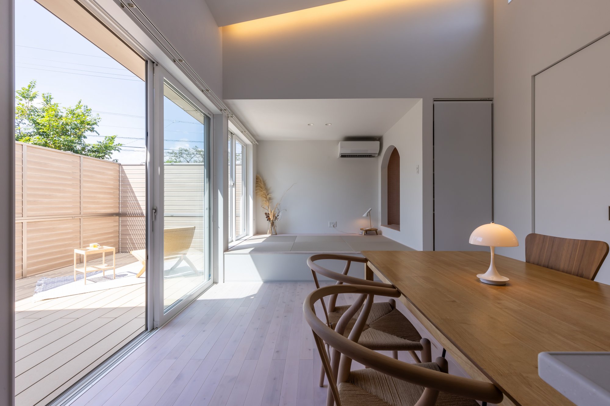 LDKは、プライバシーの保たれた中庭とつながる開放空間。リビングの南にはあえて窓を設けず、東面を大きく開放。吹き抜けと中庭から採光を得るようにした。カーテンを閉めることなく、オープンに過ごせる