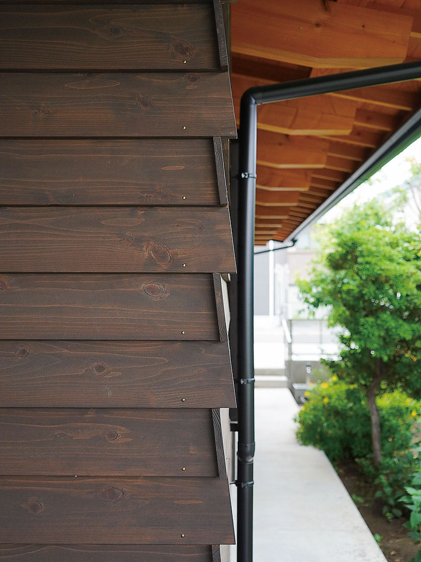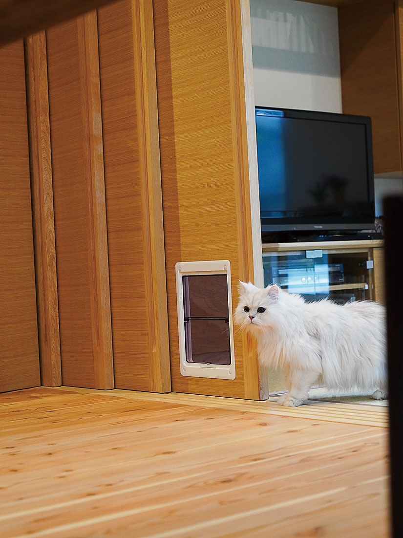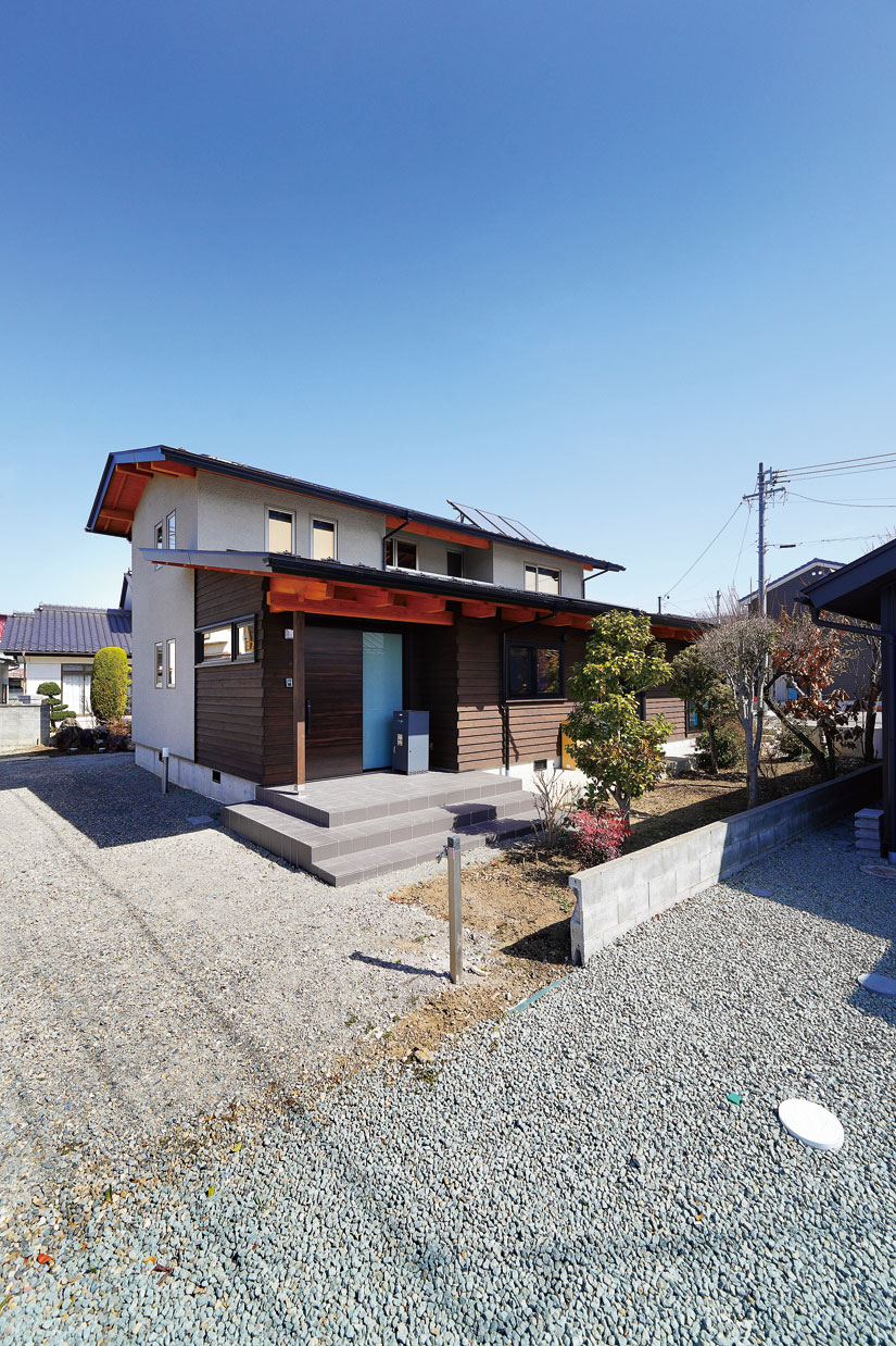 深い軒が目をひくN邸。そとん壁にスギの鎧張りを合わせた住まいには、ご家族と愛猫3匹が暮らしている。県産のカラマツをふんだんに使った室内は木の温もりたっぷり。「家にいるだけで気持ちいいんですよ」とご夫妻が迎えてくれた。