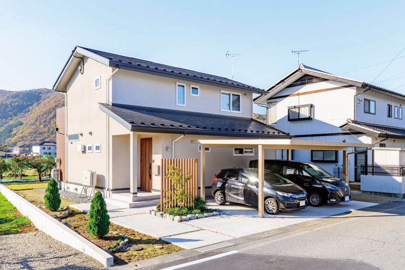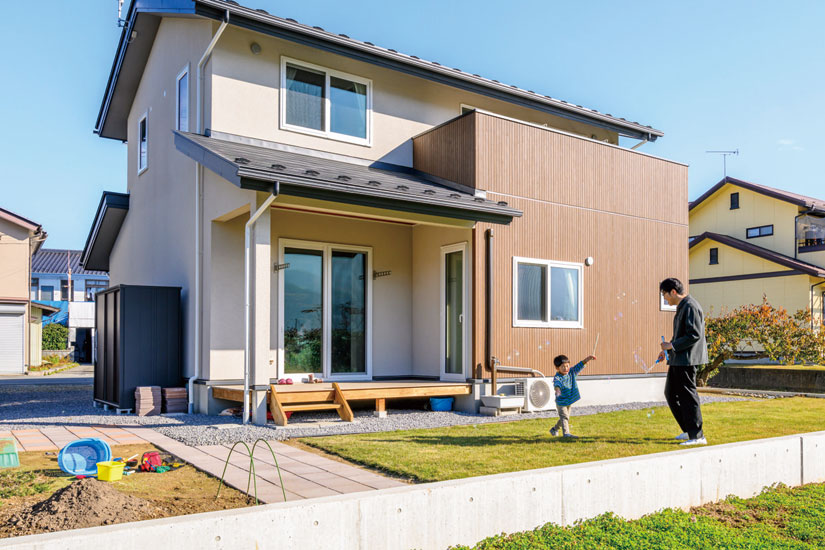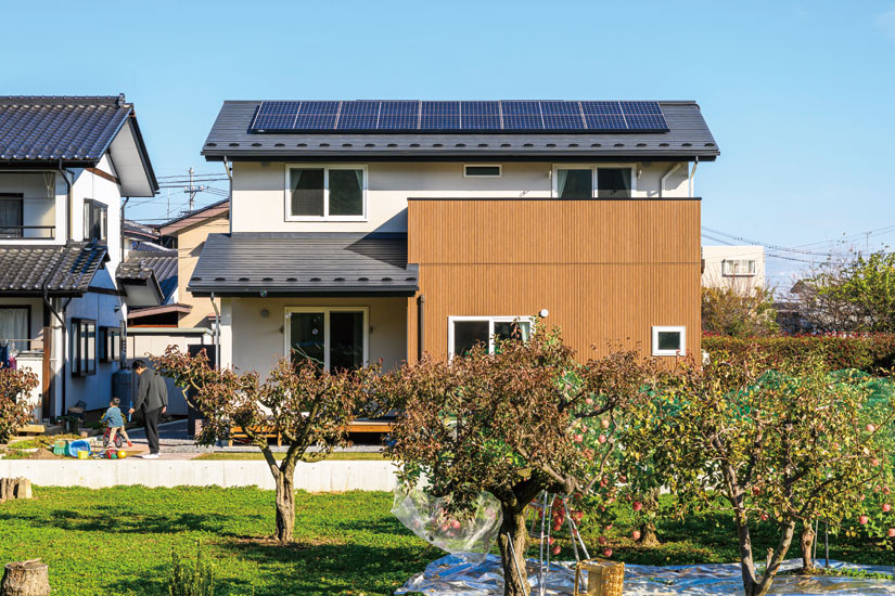 奥さまのお母さまが栽培するリンゴ、梨、梅の木などに囲まれた、のどかな郊外に建つI邸。南側の外壁にブラウンを取り入れ、和を感じる落ち着いた印象。2階のバルコニーは外からの視線が届かないよう設計し、プライバシーにも配慮されている。基本性能の高さに加え、太陽光発電パネルを搭載して創エネできる「プラスエナジーハウス」仕様。光熱費はかなり抑えられている