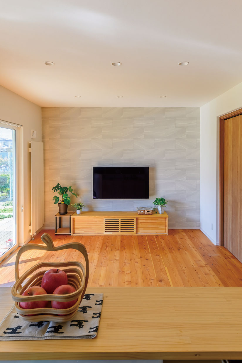 窓から見えるのは、丹精込めた美しい芝の庭、その向こうにはお母さまが手がけるリンゴ畑が広がり、赤い実が秋の日を浴びている。「夏は家族でBBQをしました。この時期は、ダイニングから見る紅葉も最高。今の暮らしにすごく満足しています」。そう語るご夫妻の穏やかな笑顔に、快適な日常への安心と満足があふれていた。