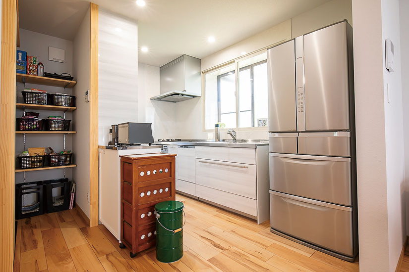 旧宅では、玄関ホールから廊下を経由してリビングやキッチン、水回りへ移動していたが、「廊下は暗くて寒く、リビングとは段差もあった」ことから、廊下をLDKへ取り込み、床もフラットに。キッチンとダイニングの位置関係は既存を活かしつつ、「作業スペースが広すぎて、使い勝手が悪かった」との悩みを、パントリーの新設で解消。パントリー奥には壁を付加し、2階に備えたトイレの配管用スペースを確保した。