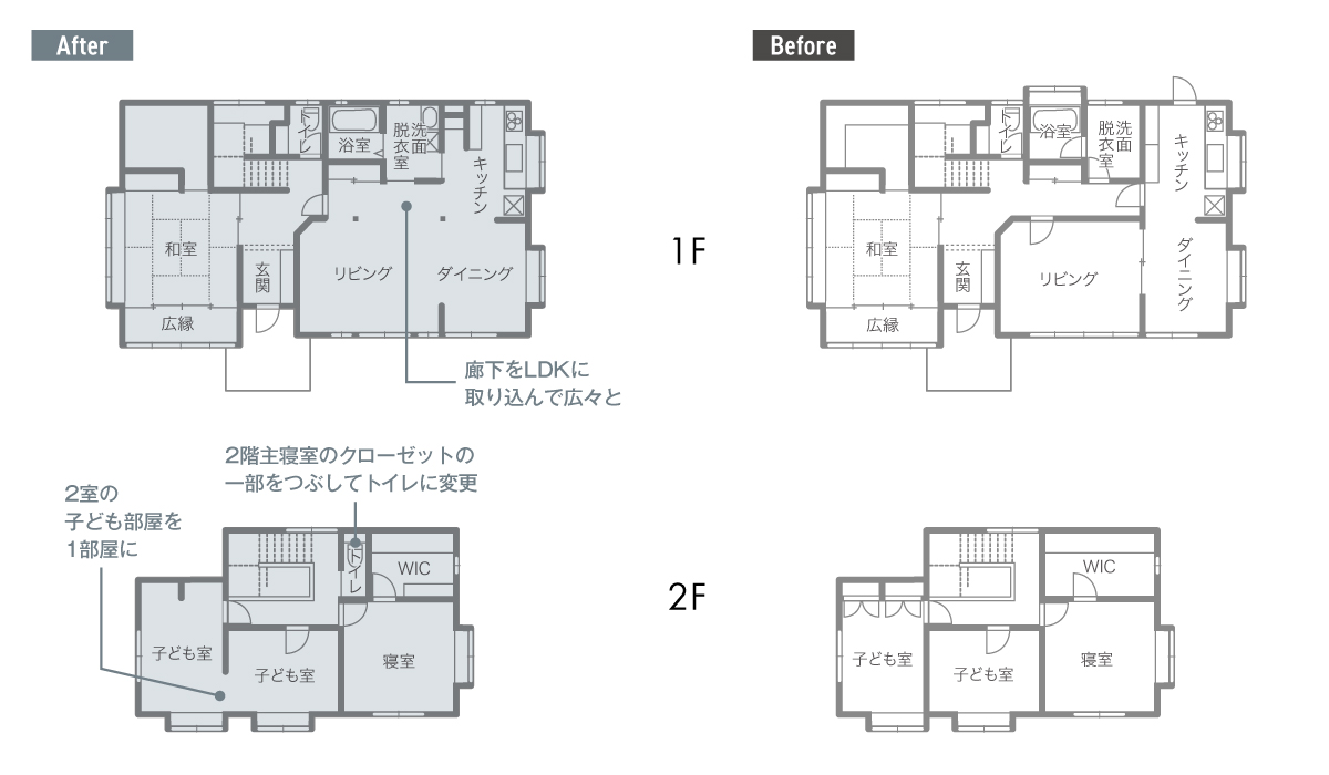 廊下をLDKに取り込むためにリビングからの見え方にも配慮。廊下側にあった収納の建具を造作し、水回りへの入り口はキッチン側へ移動。ダイニングとの境にあった建具、下がり壁を取り除き、大空間へ