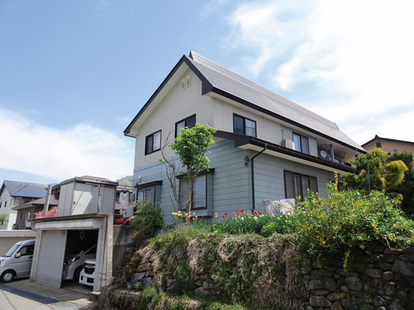 豪雪地に適した金属系サイディングで外装を一新した。明るめだった外壁を、総リブ柄がのびやかなラインを描く黒色に変更、シンプルでモダンな雰囲気を演出した。自然落雪の屋根もスーパーシリコン塗料で塗装し、新築と変わらない美しさと重厚感を備えた仕上がりとなった。(ナガノの家リフォームリノベーション Vol.9掲載)