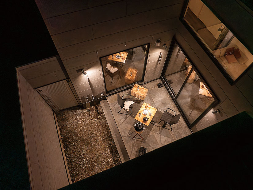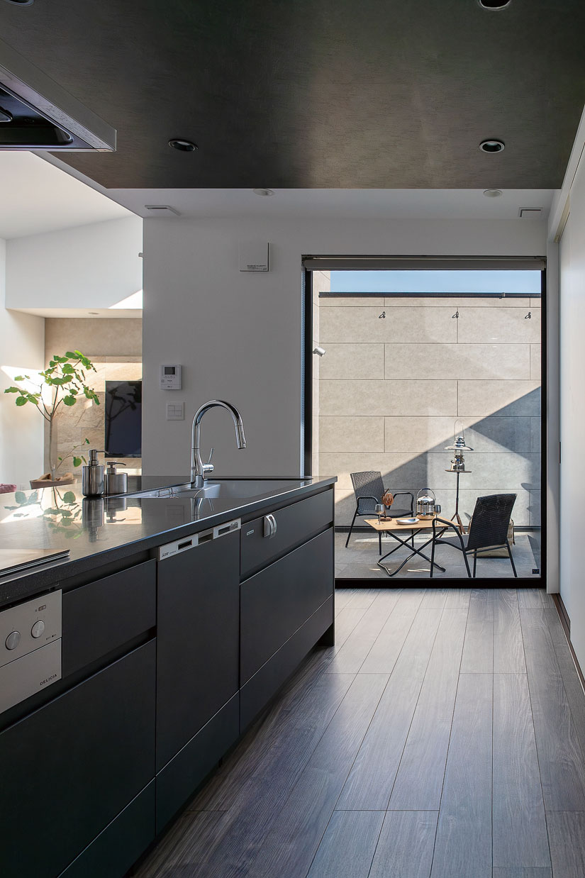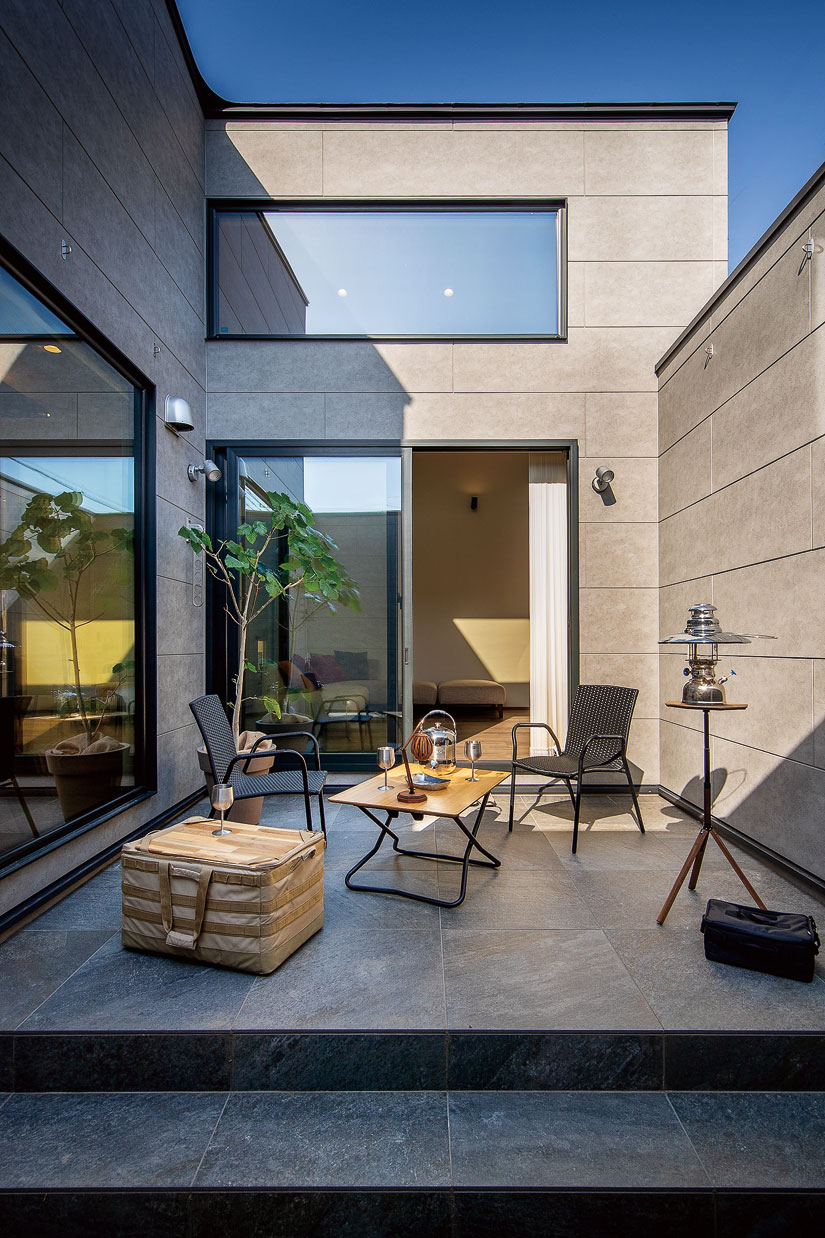 我が家のプライベートテラスとして、時間を問わず自分たちらしい使い方を楽しめる中庭。周囲は壁で囲われており、前面道路や隣家からの視線を気にせずくつろげる。「LDKから出入りできるから、ここで食事をするときの準備や後片付けもスムーズです」