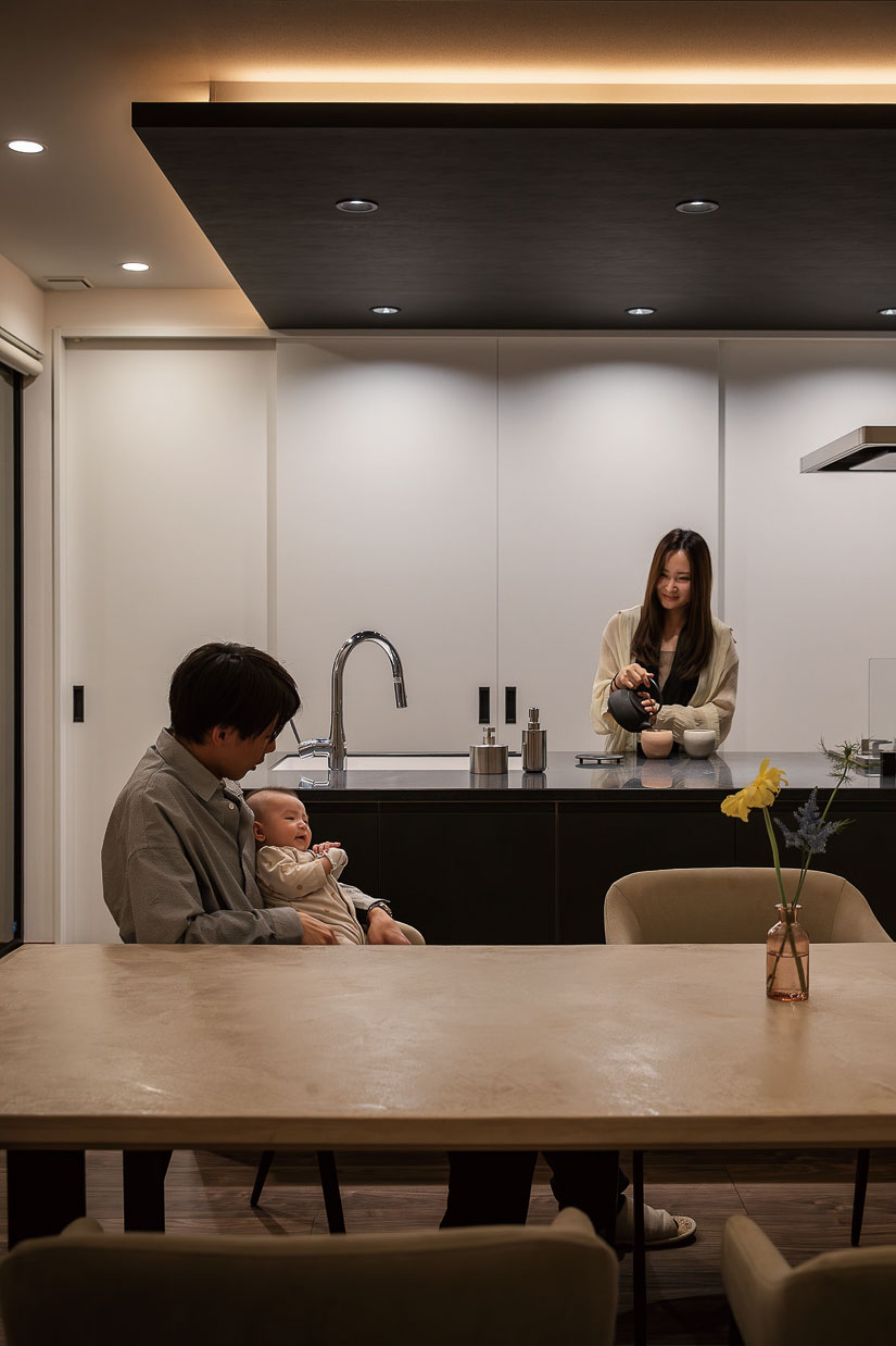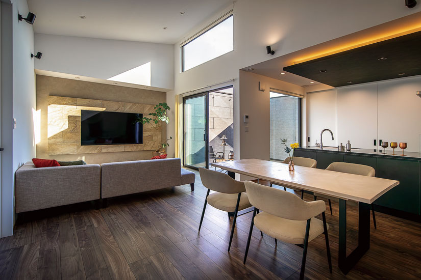完成した住まいは、交通量の多い道路に面しながらもプライバシーを確保でき、開放感も併せ持つ。LDKからつながる中庭は、日常をよりドラマチックに演出するポイント。「BBQやヨガなど、ここでやりたいことが盛り沢山。プライベート空間なので気兼ねなく過ごせます」。快適さを支えているのは性能や間取り以外にも。壁面にすっきりと収まる扉付きの収納や掃除がしやすいフラットフロア、心が整うようなシンプルモダンのインテリアなど、住む人の目線で考え抜かれた設計とデザインが、日々の暮らしやすさを常に支えている。数カ月前に生まれた長男とともに、どんなストーリーが繰り広げられるか楽しみだ。(ナガノの家vol.24 秋冬号掲載)