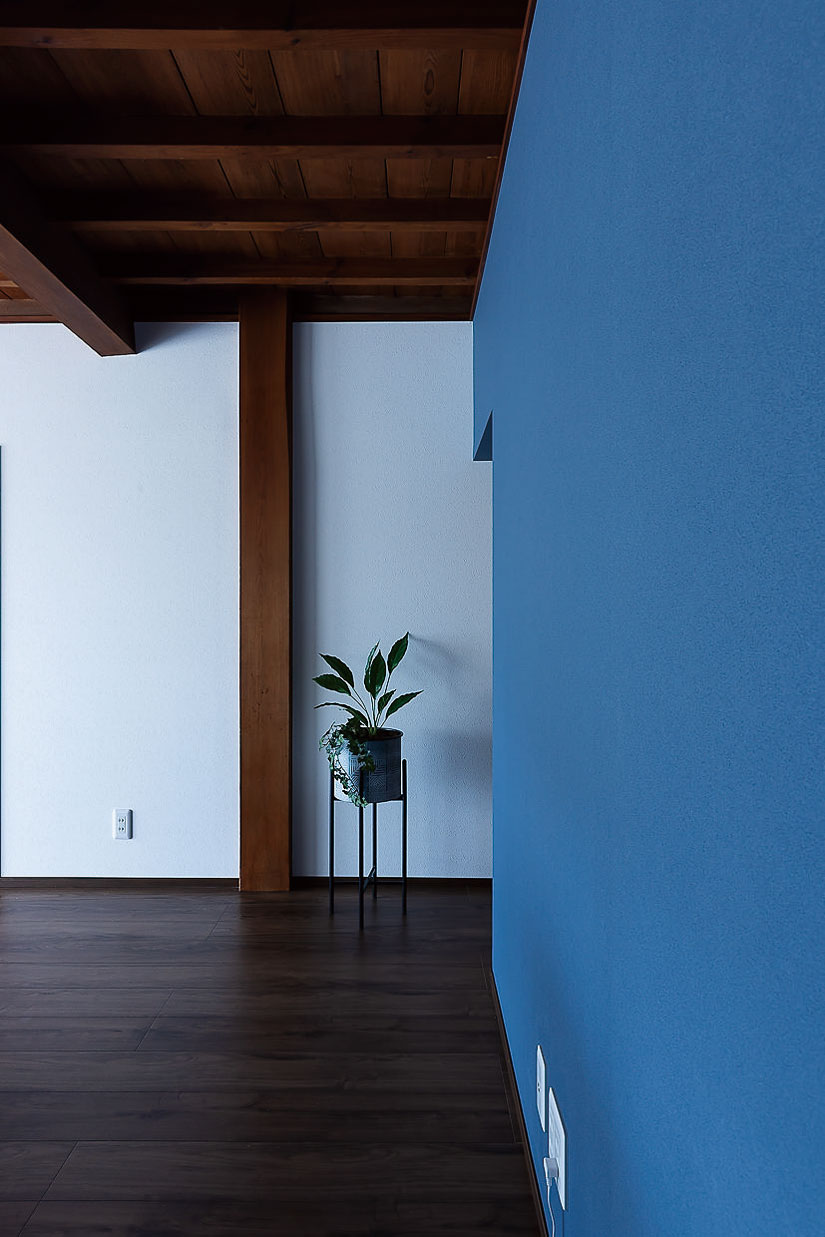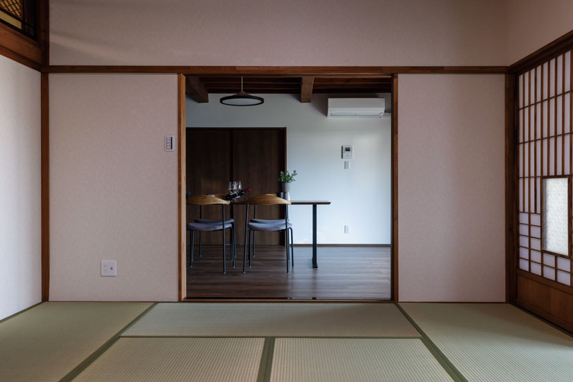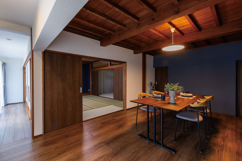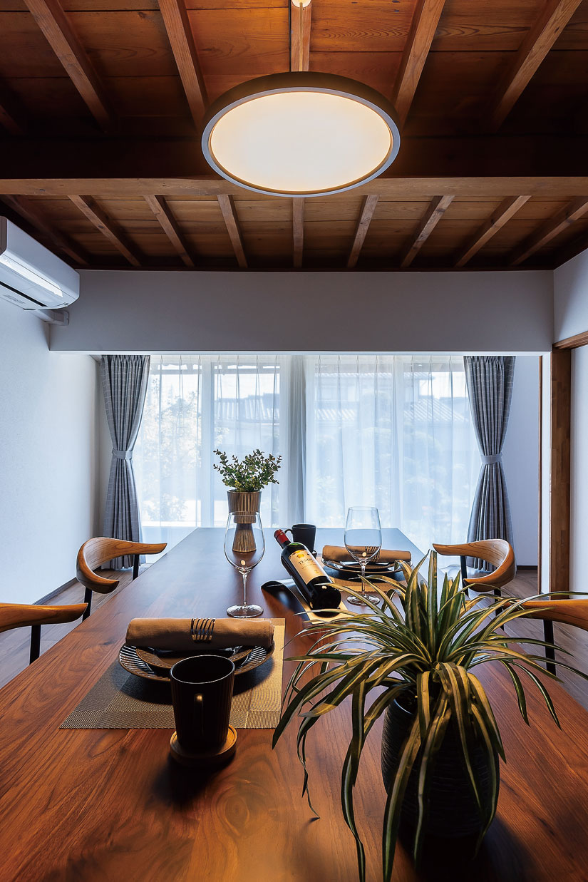 残せる部分は活かしながら改修したことで、新旧が絶妙に東和。古い家特有の低い天井による圧迫感を軽減するため、色使いに工夫を凝らすなどの配慮も行き届いている。旧家にあった調度品か違和感なく馴染む、懐かしくも新しい家へと見事に生まれ変わった。
