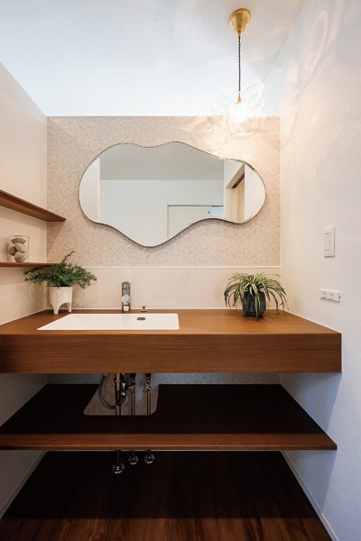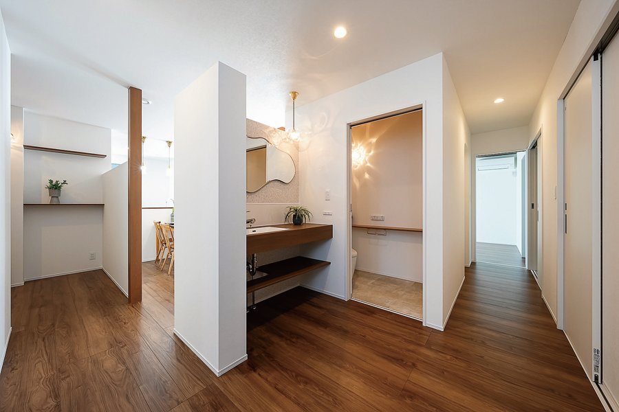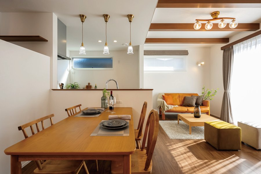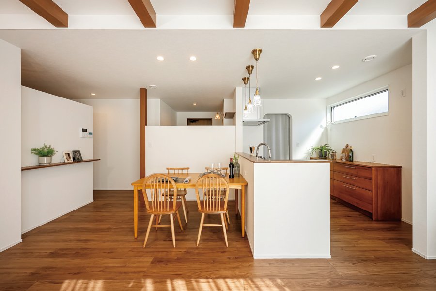 合理的でコンパクトな住まいを目指したSさんご家族が選んだのは平屋。個室や水回りにアクセスしやすいよう、LDKは家の中央に。仕切り壁を上部が空いた腰壁にすることで視線が抜け、空間同士がゆるくつながり広さが強調される。暗くなりがちな場所に南面リビングの光が柔らかく届くのもポイント。建築家・内山里江さんの巧みな空間デザインが光る