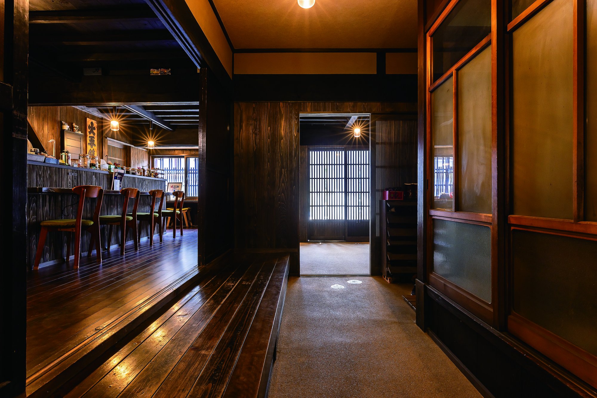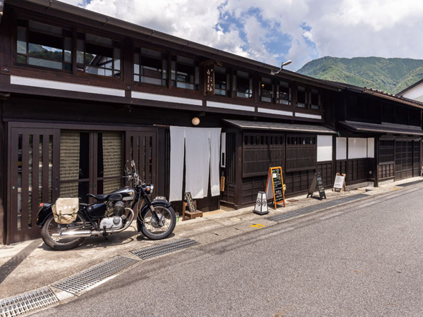 店を営むのは、バイク好きが昂じて移住したEさんご夫妻。「バイカーの聖地・信州で店を」と探し歩く中、長く空き家だったこの建物に出会った。傷みがあり、町家の面影も薄れていたが、「古さを活かした店を」と宿場町らしい併用住宅への改修を決定。地元の細田建築を頼った。「使えるものは残したい。」と要望を受けた細田社長はまず躯体の基本性能を整えるべく、耐震・断熱性を強化。水回りの床高を改めて下水道と接続し、屋根は垂木ごと掛け替えた。その上で、「店舗にはなるべく天然の木を」という思いにも応え、既存を補修しつつ新たな材をプラス。往年の姿が甦る併用住宅を完成させた。