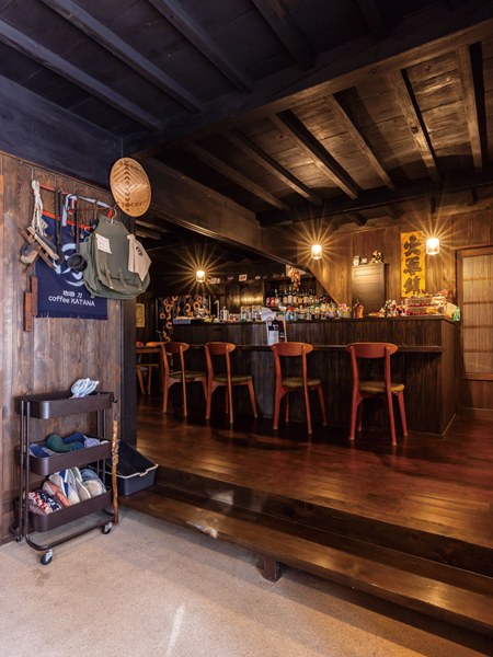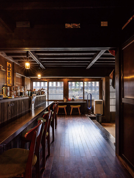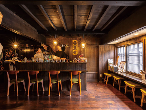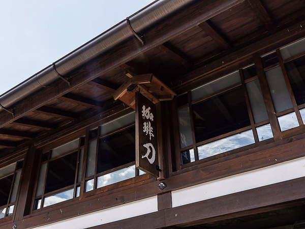 中山道木曽十一宿のひとつ、野尻宿。古い街並みが残る街道で、ひと際目をひくのが「珈琲 刀」だ。かつて鍛冶屋だった町家をリノベーションした店は、江戸時代から残る4軒連なりの町家の一棟。黒々とした柱や梁、天井板は、鍛冶場や囲炉裏の煙で燻された名残だ。面格子や鎧張りを設えた外観は情緒たっぷりで、建物を貫く通り土間はノスタルジック。古にタイムスリップしたような感覚になる。