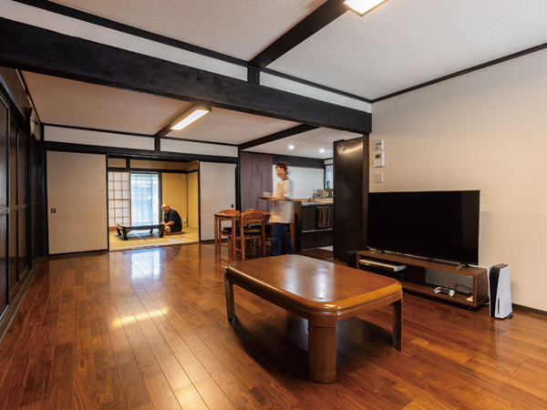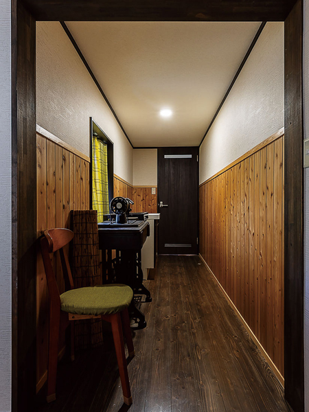 既存を活かして全体を整え、町家らしい往年の姿に。間口は5間(9.1m)で隣家と連なるつくりだが、屋根は別々。今回の改修で垂木を掛け替えて葺き替えた。かつての鍛冶場はバイクガレージに