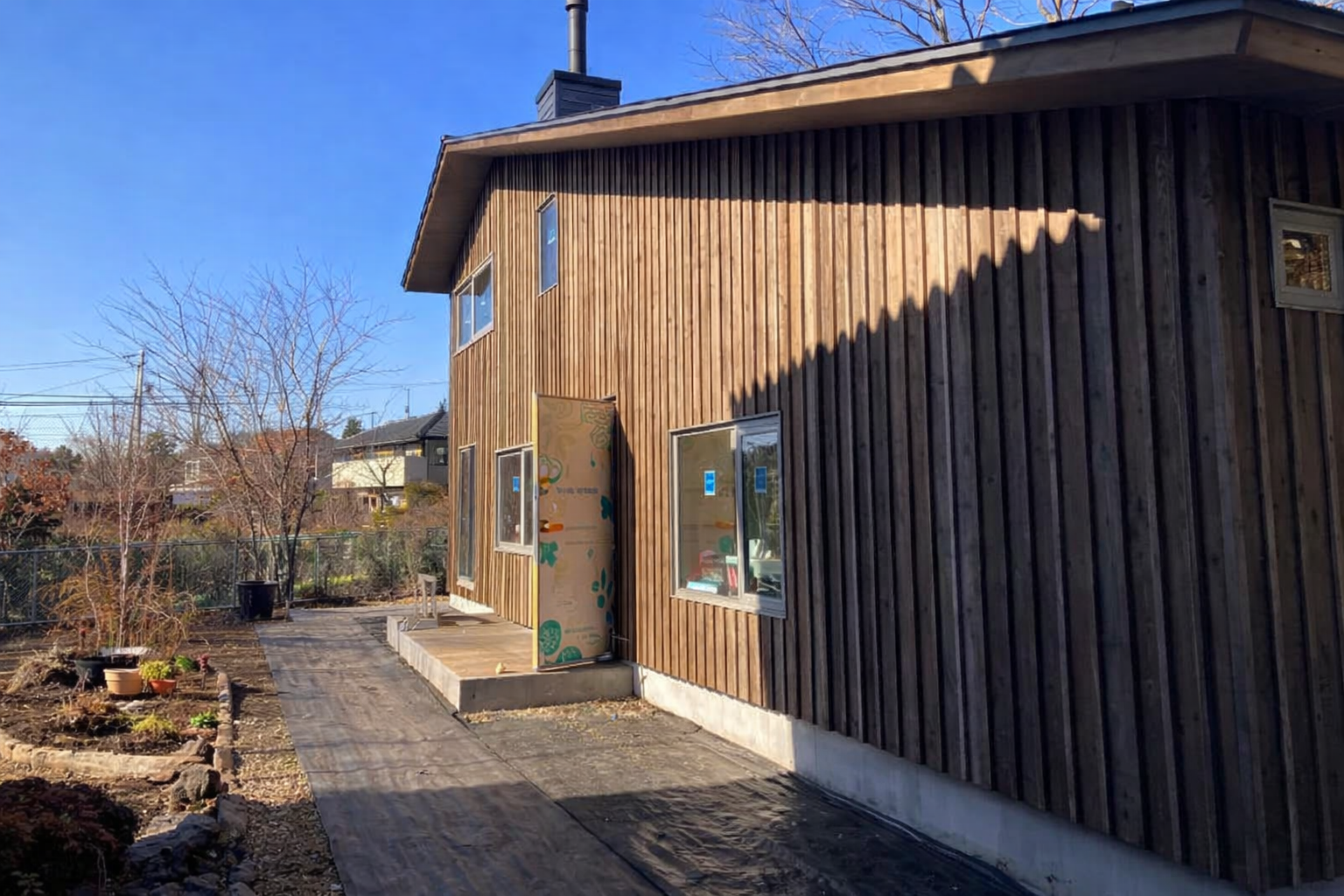 軽井沢特有の霧や湿気になじむ、板張りの外観