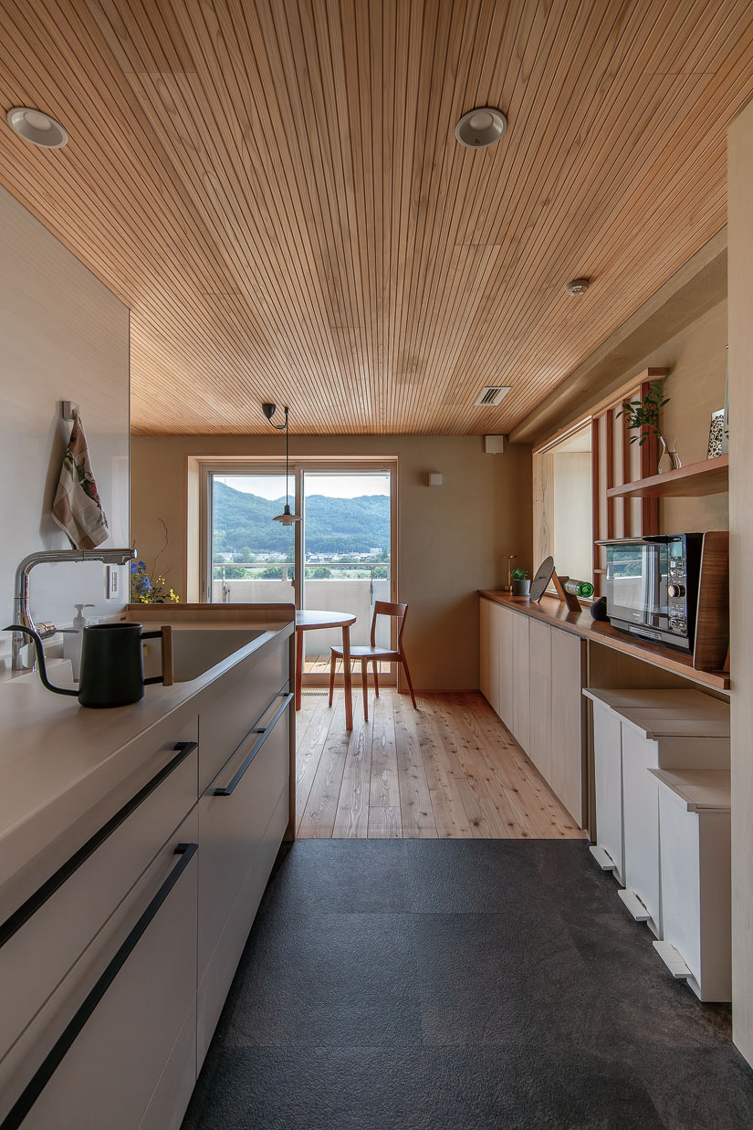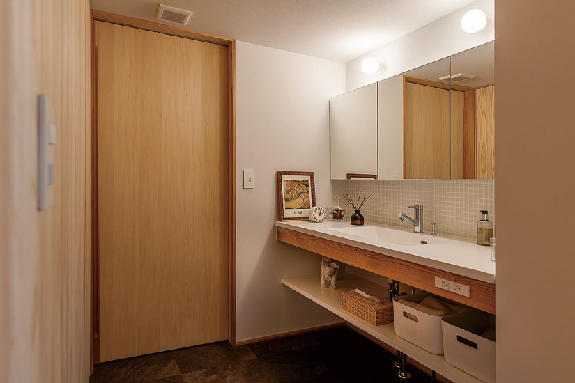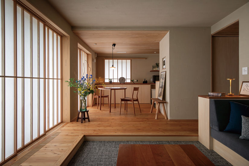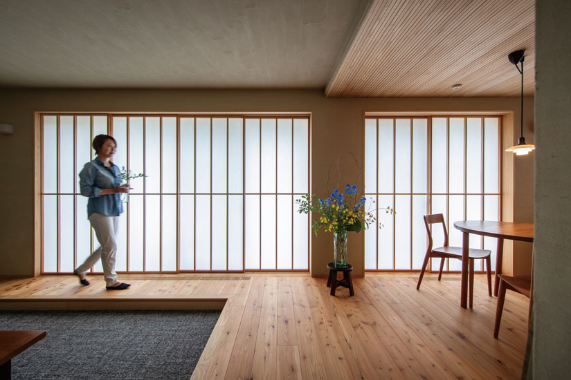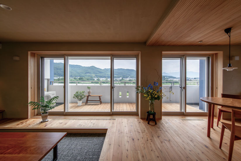 快適な住環境に整えることも目的のひとつ。空調にマンション用のパッシブエアコンを取り入れ、全室快適を実現した。1台で賄えるため、メンテナンスが格段にラクに。室外機もひとつだから、ベランダが広々使えるのもメリットだ。「ベランダに木板を敷いてもらい、リビングからつながる気持ちの良い空間になりました。視線が気にならない階層なので、基本的に障子は開けたまま。趣味のグリーンを楽しんだり、夏は涼みながら花火を見上げたりしたいです」と嬉しそう。リノベーションで手に入れた自分らしい木の家には、贅沢で上質な時間が流れている。(ナガノの家 リフォームリノベーション vol.9掲載)