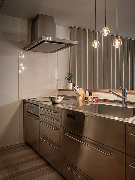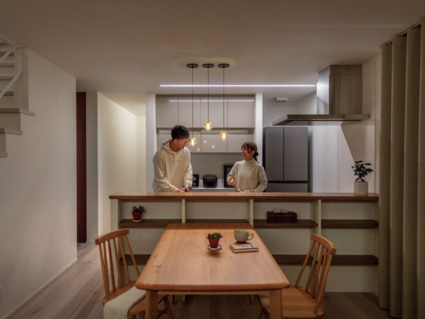 キッチンから室内が見渡せる間取りは奥さまの希望で。夕暮れからは、お二人で選んだペンダントライトと調光も可能なテレビ裏の間接照明が映える。リビング階段も「家族の会話が生まれるきっかけになれば」というご夫妻の希望で、スチールの手すりは他の箇所と色味を合わせ、やわらかなベージュを選択した