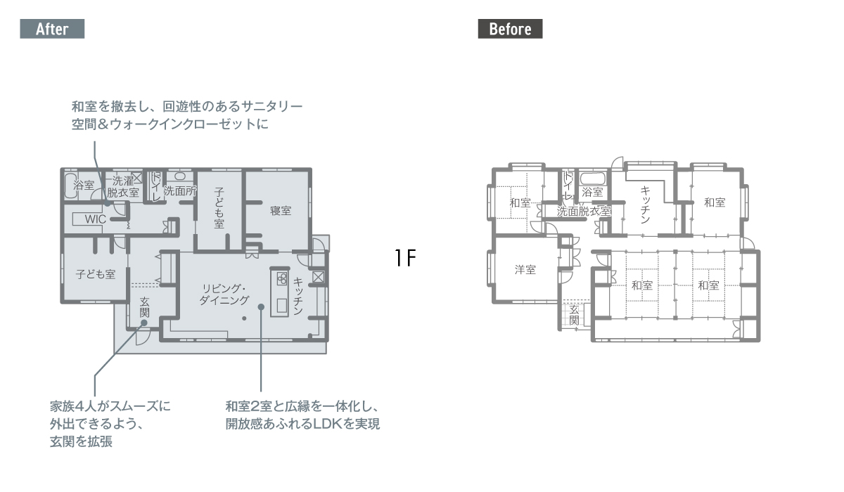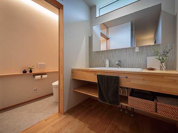 林工務店では、家族のライフスタイルに合わせ、南向きの和室2室と広縁を一体化した大空間のLDKを提案。また、和室1室を、ゆったりとしたサニタリー空間とウォークインクローゼットに再構成した。工事着手後も、「内装の方向性を変えたい」「SNSのアイディアを採り入れたい」というご夫妻の要望を反映しながら、理想の住まいを追求したという。まさに、プロの施工力と施主の思いによって推進した共同プロジェクトだ。性能面では、瓦屋根を鋼板に葺き替えるとともに、建物全体を高性能断熱材で包み、高い耐震性と居住性を確保。築半世紀の旧宅を、次の世紀へ住まい継げる現代的な住宅へ生まれ変わらせた。「引っ越してから、子どもたちが上機嫌」という奥さまの言葉通り、無垢材の床を駆け回る子どもたちの明るい声が響いていた。(ナガノの家リフォームリノベーション Vol.9掲載)