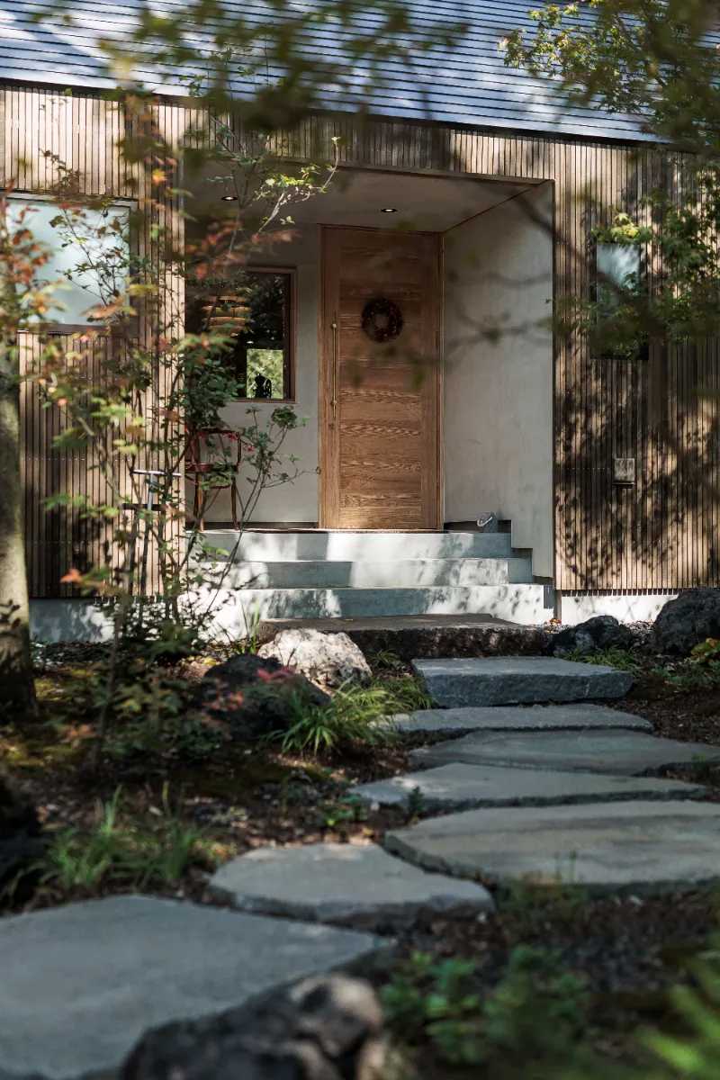 建物は、浅間山を望む静かな森の中に建ち、駐車場には地元の浅間石を砕いた砕石を敷き、アプローチには工事の際に掘り起こされた浅間石(大)と、信州に自生する植物をバランスよく配置。