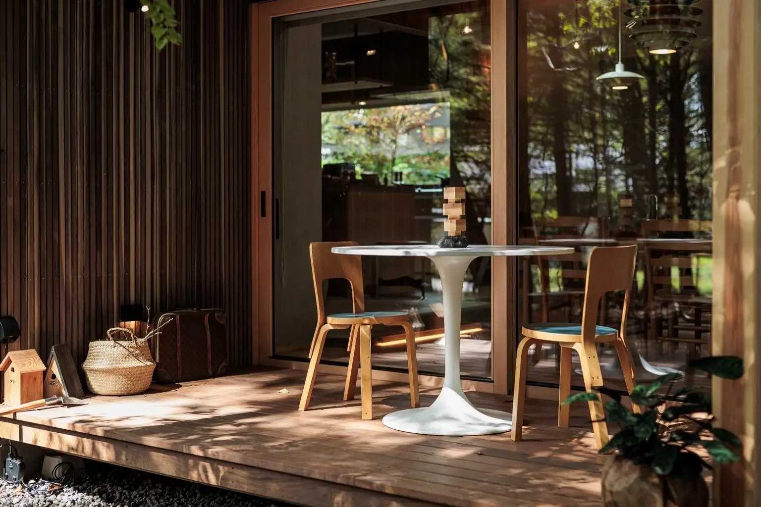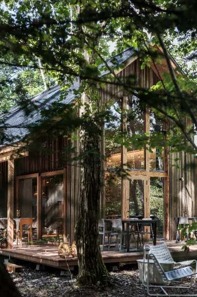 ウッドデッキ側からの店内。ユニークな素材の組み合わせに、訪れるたびに新しい驚きと発見がある。