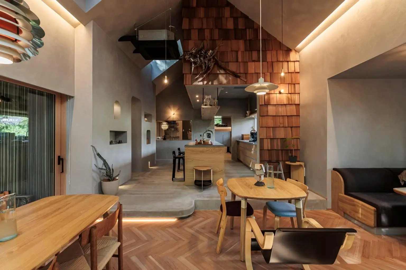 カウンター席やボックス席など、様々なスタイルで食事を楽しめる内装には「ナチュレルーフ」を使用し、本来は屋根材として使われる素材をあえて内装仕上げに転用。天窓からの自然光が素材にやさしく降り注ぐ。