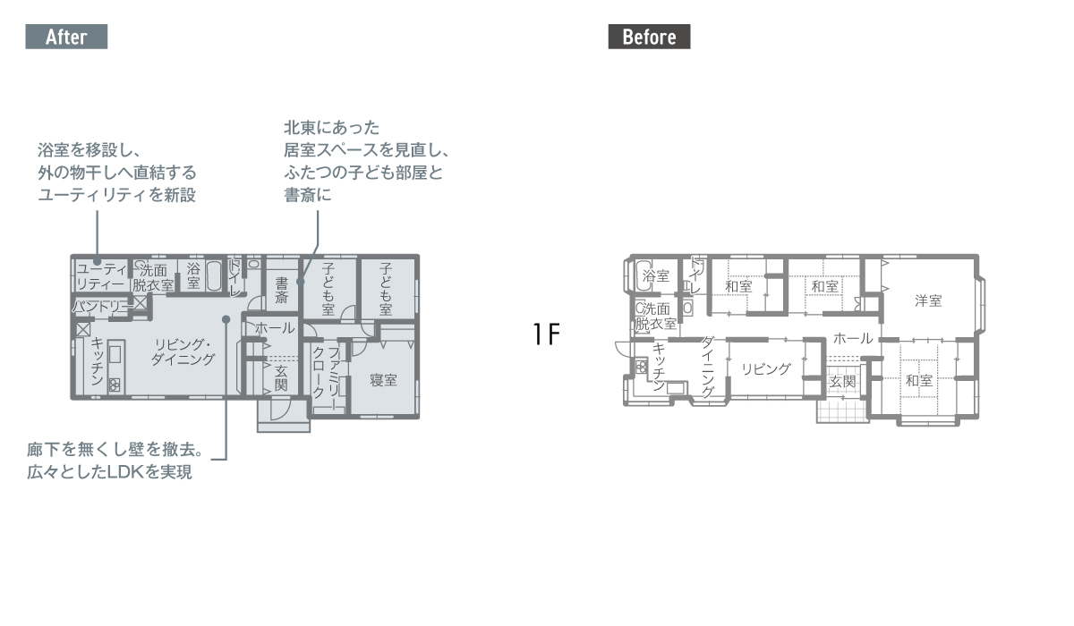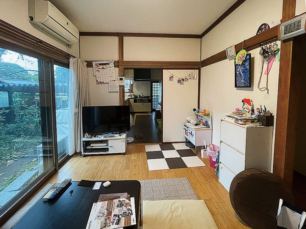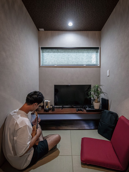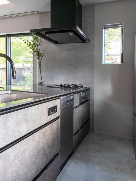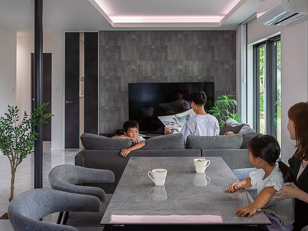 本棟造りの母屋の隣に佇むT邸は、既存の瓦屋根を活かした和モダンの外観。明るく開放的なLDKは、モノトーンのシックなフルフラットのキッチンが主役。折り上げ天井の間接照明が灯ると、ホテルのようなスタイリッシュさだ。「以前のキッチンは建具で仕切られ、リビングで家族が談笑していてもその輪に入れないのが寂しくて」と話す奥さま。「今は料理しながら家族の様子が分かり、とても幸せです」。増築や改装を繰り返してきた旧宅は特に不具合はなく、リフォームを意識しつつも緊急性は感じていなかった。「でも、子どもたちが成長するにつれてLDKが手狭になってきて。北側の和室はとても寒く、物置状態でした」とご夫妻。加えて建築費高騰への不安から、昨年秋にリフォームを決意。「新聞広告を見て初めて南澤建設さんに電話をしたのですが、その日のうちに専務さんが来てくださって。そこからはとんとん拍子でした」。一本の電話から縁がつながり、待望の改修を終えたのは出会いから約半年後。元気に遊ぶ子どもたちを眺め、ご夫妻は目を細める。「リビングの壁にプロジェクターを映し、晩酌とともに楽しむ時間が最高です」と、大満足の我が家が誕生した。(ナガノの家リフォームリノベーション Vol.9掲載)