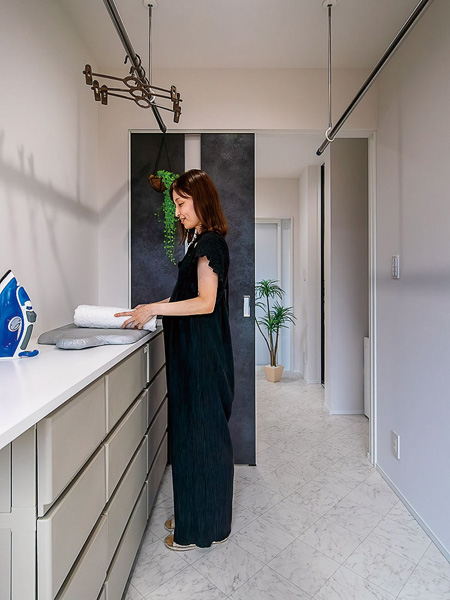 リビング北側にあった廊下や間仕切り建具のあったダイニングキッチンなども一体化し、開放的なLDKを実現。柱や梁、壁の補強で耐震性も十分に確保した。ダイニング側に備えた収納やキッチン北側のパントリーなど、十分な収納もこだわりのひとつ