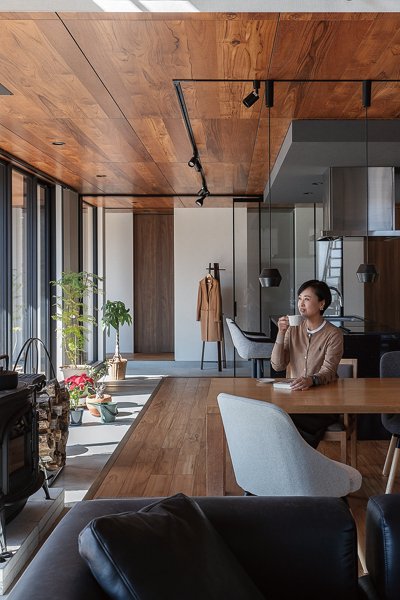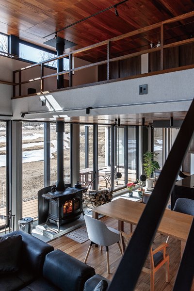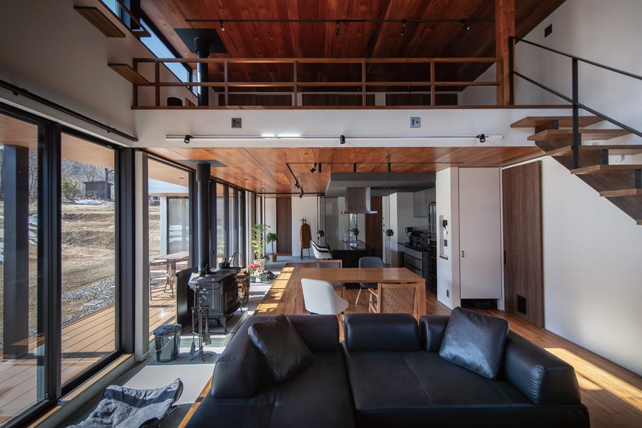 LDK南側には大きな開口が連なり、窓の向こうに広がる豊かな景色が暮らしに彩りを添えるK邸。「登山の拠点として構えた家ですが、快適すぎてほぼ安曇野で過ごしています」とほほ笑むご夫妻。遠くまで視線が抜ける大空間で、穏やかな時間を満喫している